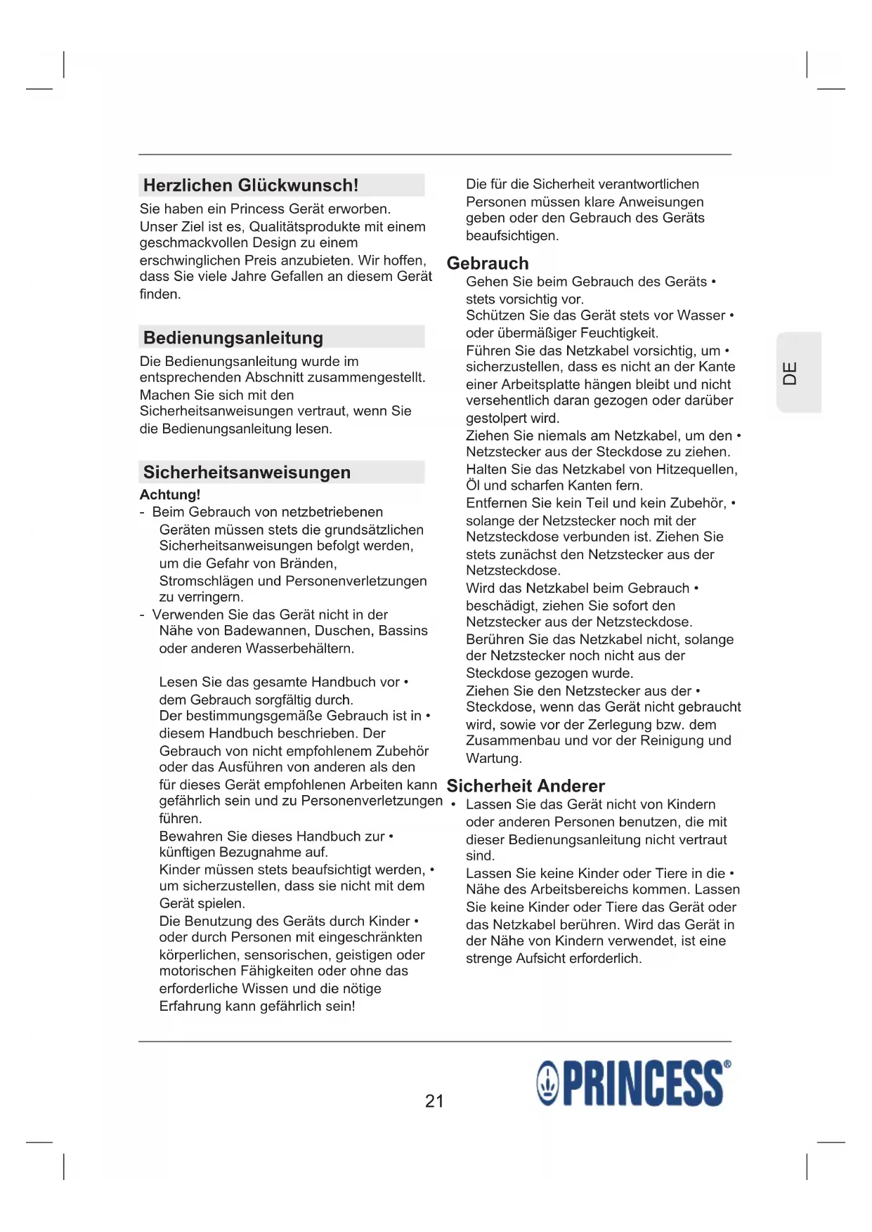 Herzlichen Glückwunsch! Sie haben ein Princess Gerät erworben. Unser Ziel ist es, Qualitätsprodukte mit einem geschmackvollen Design zu einem erschwinglichen Preis anzubieten. Wir hoffen, dass Sie viele Jahre Gefallen an diesem Gerät finden. Bedienungsanleitung Die Bedienungsanleitung wurde im entsprechenden Abschnitt zusammengestellt. Machen Sie sich mit den Sicherheitsanweisungen vertraut, wenn Sie die Bedienungsanleitung lesen. Sicherheitsanweisungen Achtung! - Beim Gebrauch von netzbetriebenen Geräten müssen stets die grundsätzlichen Sicherheitsanweisungen befolgt werden, um die Gefahr von Bränden, Stromschlägen und Personenverletzungen zu verringern. - Verwenden Sie das Gerät nicht in der Nähe von Badewannen, Duschen, Bassins oder anderen Wasserbehältern. Lesen Sie das gesamte Handbuch vor • dem Gebrauch sorgfältig durch. Der bestimmungsgemäße Gebrauch ist in • diesem Handbuch beschrieben. Der Gebrauch von nicht empfohlenem Zubehör oder das Ausführen von anderen als den für dieses Gerät empfohlenen Arbeiten kann gefährlich sein und zu Personenverletzungen führen. Bewahren Sie dieses Handbuch zur • künftigen Bezugnahme auf. Kinder müssen stets beaufsichtigt werden, • um sicherzustellen, dass sie nicht mit dem Gerät spielen. Die Benutzung des Geräts durch Kinder • oder durch Personen mit eingeschränkten körperlichen, sensorischen, geistigen oder motorischen Fähigkeiten oder ohne das erforderliche Wissen und die nötige Erfahrung kann gefährlich sein! Die für die Sicherheit verantwortlichen Personen müssen klare Anweisungen geben oder den Gebrauch des Geräts beaufsichtigen. Gebrauch Gehen Sie beim Gebrauch des Geräts • stets vorsichtig vor. Schützen Sie das Gerät stets vor Wasser • oder übermäßiger Feuchtigkeit. Führen Sie das Netzkabel vorsichtig, um • sicherzustellen, dass es nicht an der Kante einer Arbeitsplatte hängen bleibt und nicht versehentlich daran gezogen oder darüber gestolpert wird. Ziehen Sie niemals am Netzkabel, um den • Netzstecker aus der Steckdose zu ziehen. Halten Sie das Netzkabel von Hitzequellen, Öl und scharfen Kanten fern. Entfernen Sie kein Teil und kein Zubehör, • solange der Netzstecker noch mit der Netzsteckdose verbunden ist. Ziehen Sie stets zunächst den Netzstecker aus der Netzsteckdose. Wird das Netzkabel beim Gebrauch • beschädigt, ziehen Sie sofort den Netzstecker aus der Netzsteckdose. Berühren Sie das Netzkabel nicht, solange der Netzstecker noch nicht aus der Steckdose gezogen wurde. Ziehen Sie den Netzstecker aus der • Steckdose, wenn das Gerät nicht gebraucht wird, sowie vor der Zerlegung bzw. dem Zusammenbau und vor der Reinigung und Wartung. Sicherheit Anderer Lassen Sie das Gerät nicht von Kindern • oder anderen Personen benutzen, die mit dieser Bedienungsanleitung nicht vertraut sind. Lassen Sie keine Kinder oder Tiere in die • Nähe des Arbeitsbereichs kommen. Lassen Sie keine Kinder oder Tiere das Gerät oder das Netzkabel berühren. Wird das Gerät in der Nähe von Kindern verwendet, ist eine strenge Aufsicht erforderlich.2222