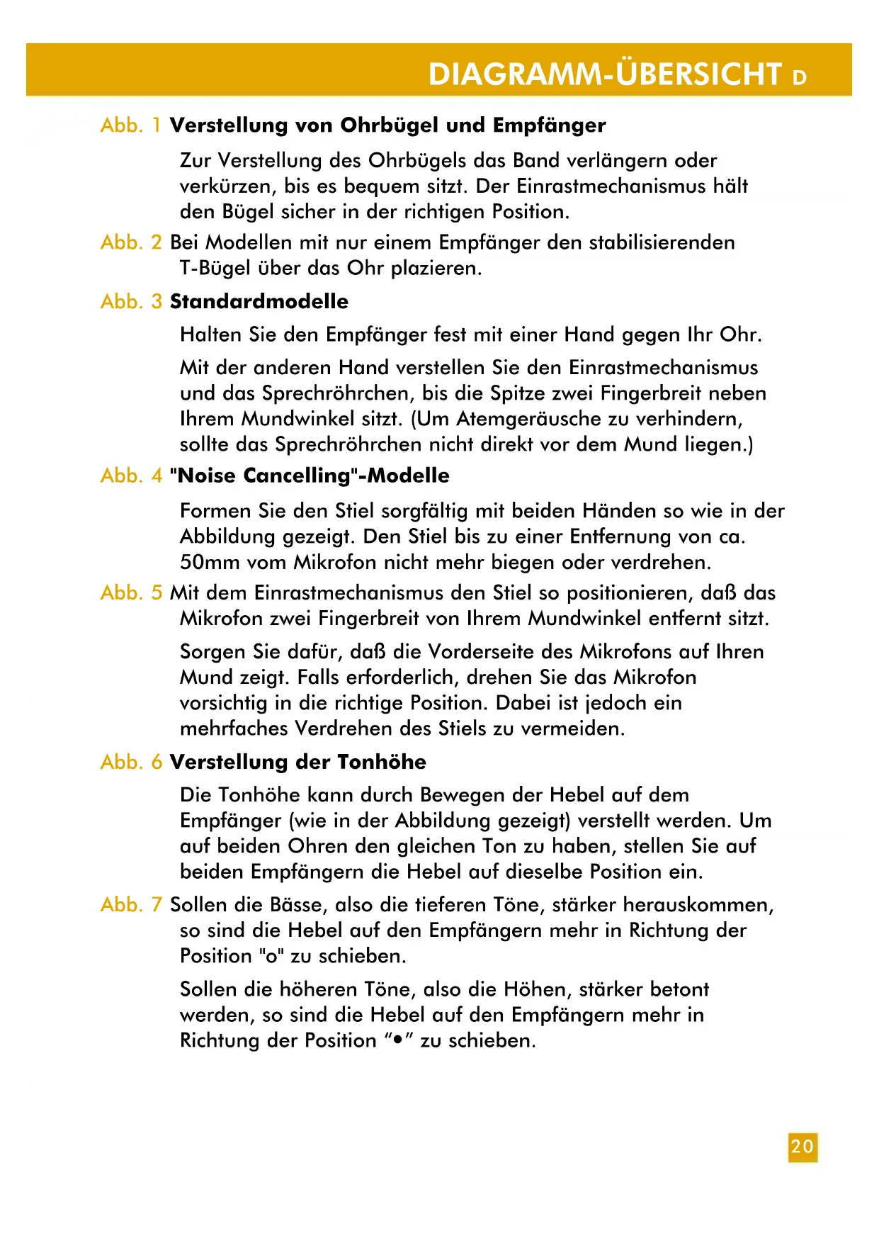 Abb. 1 Verstellung von Ohrbügel und Empfänger Zur Verstellung des Ohrbügels das Band verlängern oder verkürzen, bis es bequem sitzt. Der Einrastmechanismus hält den Bügel sicher in der richtigen Position. Abb. 2 Bei Modellen mit nur einem Empfänger den stabilisierenden T-Bügel über das Ohr plazieren. Abb. 3 Standardmodelle Halten Sie den Empfänger fest mit einer Hand gegen Ihr Ohr. Mit der anderen Hand verstellen Sie den Einrastmechanismus und das Sprechröhrchen, bis die Spitze zwei Fingerbreit neben Ihrem Mundwinkel sitzt. (Um Atemgeräusche zu verhindern, sollte das Sprechröhrchen nicht direkt vor dem Mund liegen.) Abb. 4 "Noise Cancelling"-Modelle Formen Sie den Stiel sorgfältig mit beiden Händen so wie in der Abbildung gezeigt. Den Stiel bis zu einer Entfernung von ca. 50mm vom Mikrofon nicht mehr biegen oder verdrehen. Abb. 5 Mit dem Einrastmechanismus den Stiel so positionieren, daß das Mikrofon zwei Fingerbreit von Ihrem Mundwinkel entfernt sitzt. Sorgen Sie dafür, daß die Vorderseite des Mikrofons auf Ihren Mund zeigt. Falls erforderlich, drehen Sie das Mikrofon vorsichtig in die richtige Position. Dabei ist jedoch ein mehrfaches Verdrehen des Stiels zu vermeiden. Abb. 6 Verstellung der Tonhöhe Die Tonhöhe kann durch Bewegen der Hebel auf dem Empfänger (wie in der Abbildung gezeigt) verstellt werden. Um auf beiden Ohren den gleichen Ton zu haben, stellen Sie auf beiden Empfängern die Hebel auf dieselbe Position ein. Abb. 7 Sollen die Bässe, also die tieferen Töne, stärker herauskommen, so sind die Hebel auf den Empfängern mehr in Richtung der Position "o" zu schieben. Sollen die höheren Töne, also die Höhen, stärker betont werden, so sind die Hebel auf den Empfängern mehr in Richtung der Position “