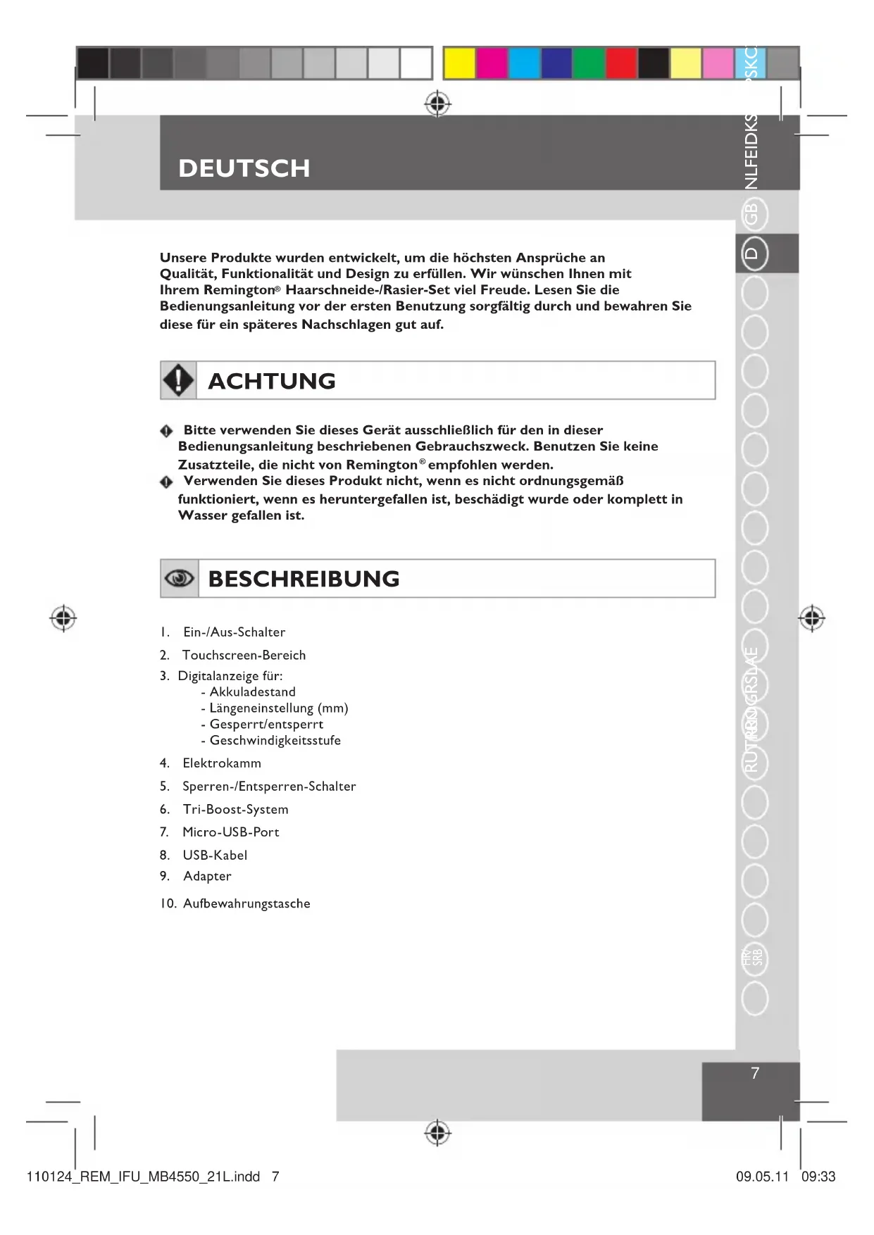 Verwenden Sie dieses Produkt nicht, wenn es nicht ordnungsgemäß funktioniert, wenn es heruntergefallen ist, beschädigt wurde oder komplett in Wasser gefallen ist. BESCHREIBUNG 1. Ein-/Aus-Schalter2. Touchscreen-Bereich3. Digitalanzeige für:- Akkuladestand- Längeneinstellung (mm)- Gesperrt/entsperrt- Geschwindigkeitsstufe4. Elektrokamm5. Sperren-/Entsperren-Schalter6. Tri-Boost-System 7. Micro-USB-Por t 8. USB-Kabel9. Adapter10. Aufbewahrungstasche110124_REM_IFU_MB4550_21L.indd 7 09.05.11 09:33DEUTSCH