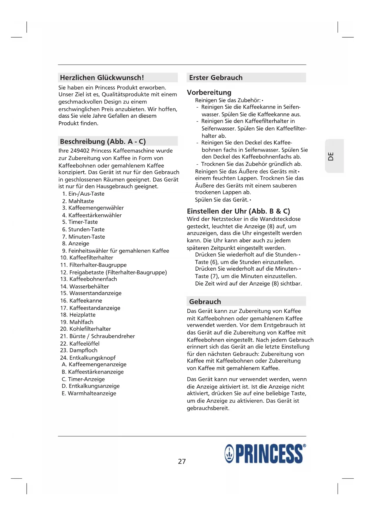 Herzlichen Glückwunsch! Sie haben ein Princess Produkt erworben. Unser Ziel ist es, Qualitätsprodukte mit einem geschmackvollen Design zu einem erschwinglichen Preis anzubieten. Wir hoffen, dass Sie viele Jahre Gefallen an diesem Produkt finden. Beschreibung (Abb. A - C) Ihre 249402 Princess Kaffeemaschine wurde zur Zubereitung von Kaffee in Form von Kaffeebohnen oder gemahlenem Kaffee konzipiert. Das Gerät ist nur für den Gebrauch in geschlossenen Räumen geeignet. Das Gerät ist nur für den Hausgebrauch geeignet.