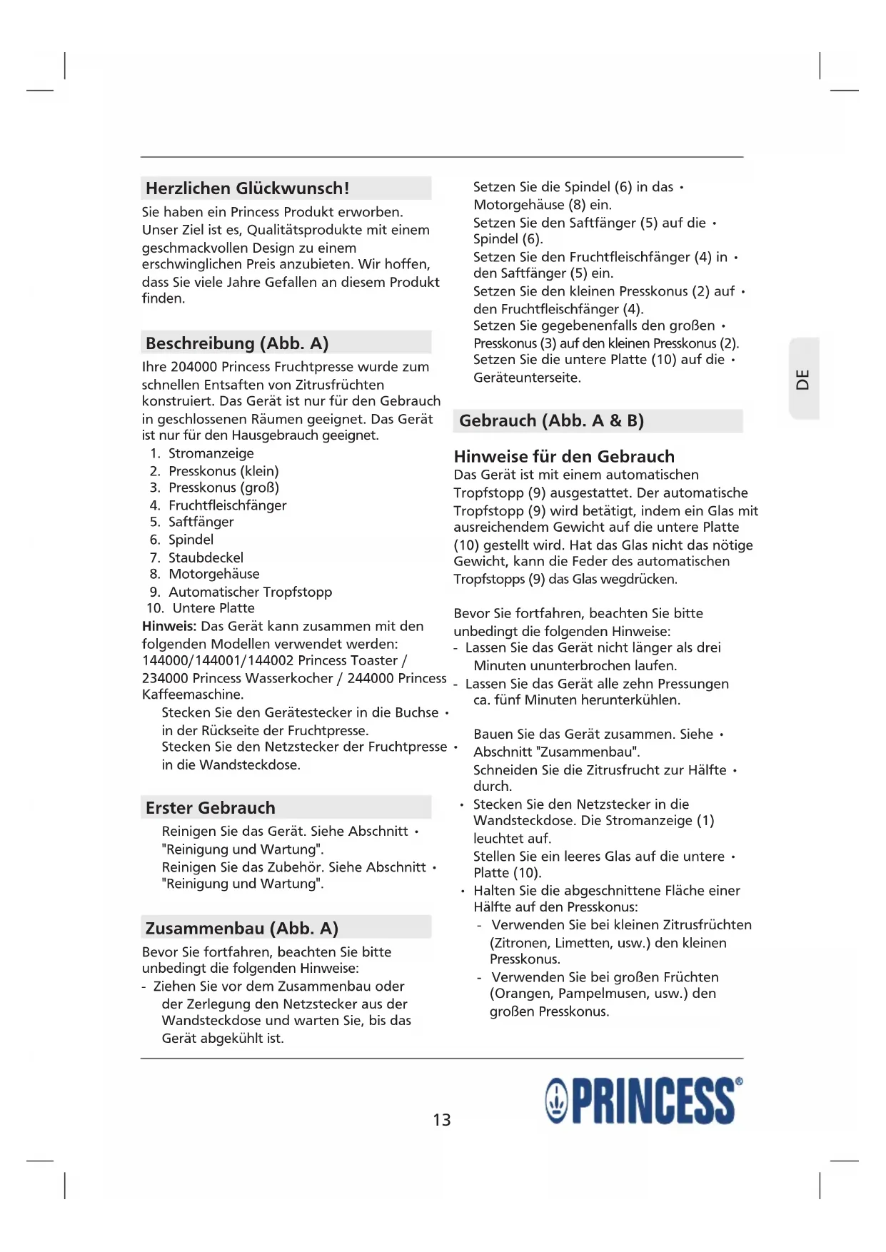 Herzlichen Glückwunsch! Sie haben ein Princess Produkt erworben. Unser Ziel ist es, Qualitätsprodukte mit einem geschmackvollen Design zu einem erschwinglichen Preis anzubieten. Wir hoffen, dass Sie viele Jahre Gefallen an diesem Produkt finden. Beschreibung (Abb. A) Ihre 204000 Princess Fruchtpresse wurde zum schnellen Entsaften von Zitrusfrüchten konstruiert. Das Gerät ist nur für den Gebrauch in geschlossenen Räumen geeignet. Das Gerät ist nur für den Hausgebrauch geeignet.