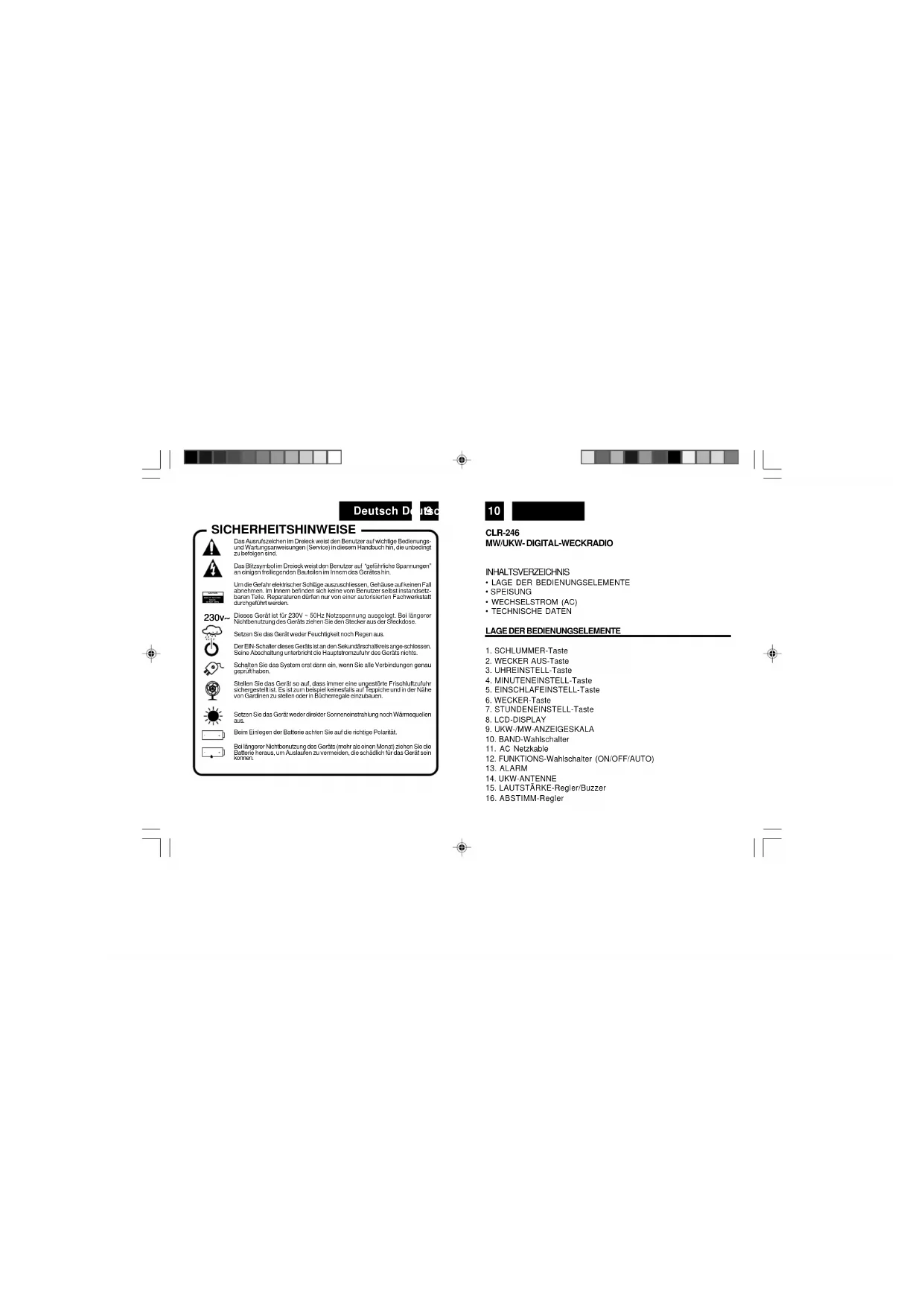 Zu ihrer eigenen Sicherheit lessen Sie aufmarks die folgende Bedienungsanleitung, bevor Sie diese Weckradio ans Netz anschließen.