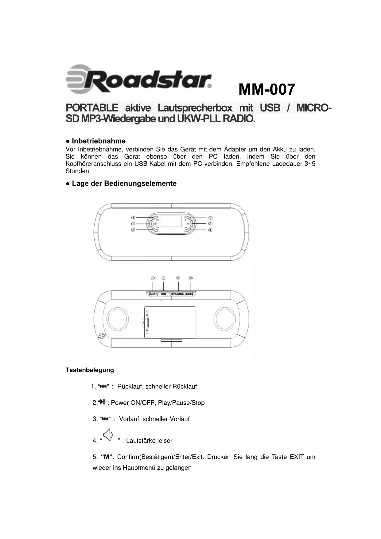 Betriebstemperatur -5 to 50 Grad Kein Strom Prüfen Sie, ob Sie die Stützbatterien korrekt eingelegt haben und diese über genug Kapazität verfügen. Kein Ton Prüfen Sie, ob die Lautstärkeeinstellung 0 ist. Überprüfen Sie die Verbindung mit dem Kopfhörer. Vergewissern Sie sich, dass die Kopfhörer nicht verschmutz sind. Beschädigte MP3-Dateien können Geräusche verursachen, auch wenn diese nicht abgespielt werden können. Display zeigt unbekannte Zeichen Stellen Sie sicher, dass Sie die richtige Sprache ausgewählt haben. Schlechtes FM-Signal Verändern Sie die Position des Line-In Kabels. Schalten Sie andere elektronische Geräte aus. Line-In Kabel kann als Antenne genutzt werden.AUF GRUND STÄNDIGER VERBESSERUNGEN BLEIBT DIE ÄNDERUNG DER TECHNISCHEN DATEN UND DES DESIGNS OHNE VORANKÜNDIGUNG VORBEHALTEN. is a registered Trademark of Roadstar S.A. - Switzerland All rights reserved ACHTUNG! Die Verwendung von MP3-codierten Dateien mit diesem Gerät ist nur zum privaten Gebrauch und nicht zu kommerziellen Zwecken gestattet. Korrekte Entsorgung dieses Produkts (Elektromüll) Die Kennzeichnung auf dem Produkt bzw. auf der dazugehörigen Literatur gibt an, dass es nach seiner Lebensdauer nicht zusammen mit dem normalen HaushaltsmüIl entsorgt werden darf. Entsorgen Sie dieses Gerat bitte getrennt von anderen Abfallen, um der Umwelt bzw. der menschlichen Gesundheit nicht durch unkontrollierte Müllbeseitigung zu schaden. Recyceln Sie das Gerät, um die nachhaltige Wiederverwertung von stofflichen Ressourcen zu fördern. Private Nutzer sollten den Händler, bei dem das Produkt gekauft wurde, oder die zuständigen Behörden kontaktieren, um in Erfahrung zu bringen, wie sie das Gerät auf umweltfreundliche Weise recyceln können. Gewerbliche Nutzer sollten sich an Ihren Lieferanten wenden und die Bedingungen des Verkaufsvertrags konsultieren. Dieses Produkt darf nicht zusammen mit anderem Gewerbemüll entsorgt werden.MM-007 Haut-parleurs PORTATIFS avec connecteur USB / MICRO-SD, lecteur MP3 et radio intégrée UKW-PLL ● Mise en service Avant de mettre l'appareil sous tension, reliez le lecteur à l'adaptateur pour recharger la batterie intégrée. Vous pouvez aussi la recharger en reliant l'appareil à la prise jack du casque de votre PC à l’aide du câble USB. Nous recommandons de recharger l'appareil entre 3 et 5 heures. ● Emplacement des éléments de commande Description des touches