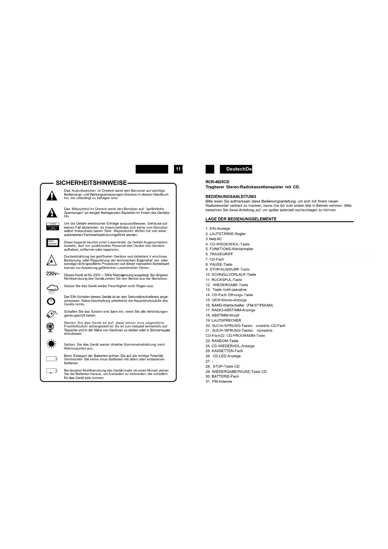 RCR-4625CD Tragbarer Stereo-Radiokassettenspieler mit CD.DeutschDeutsch