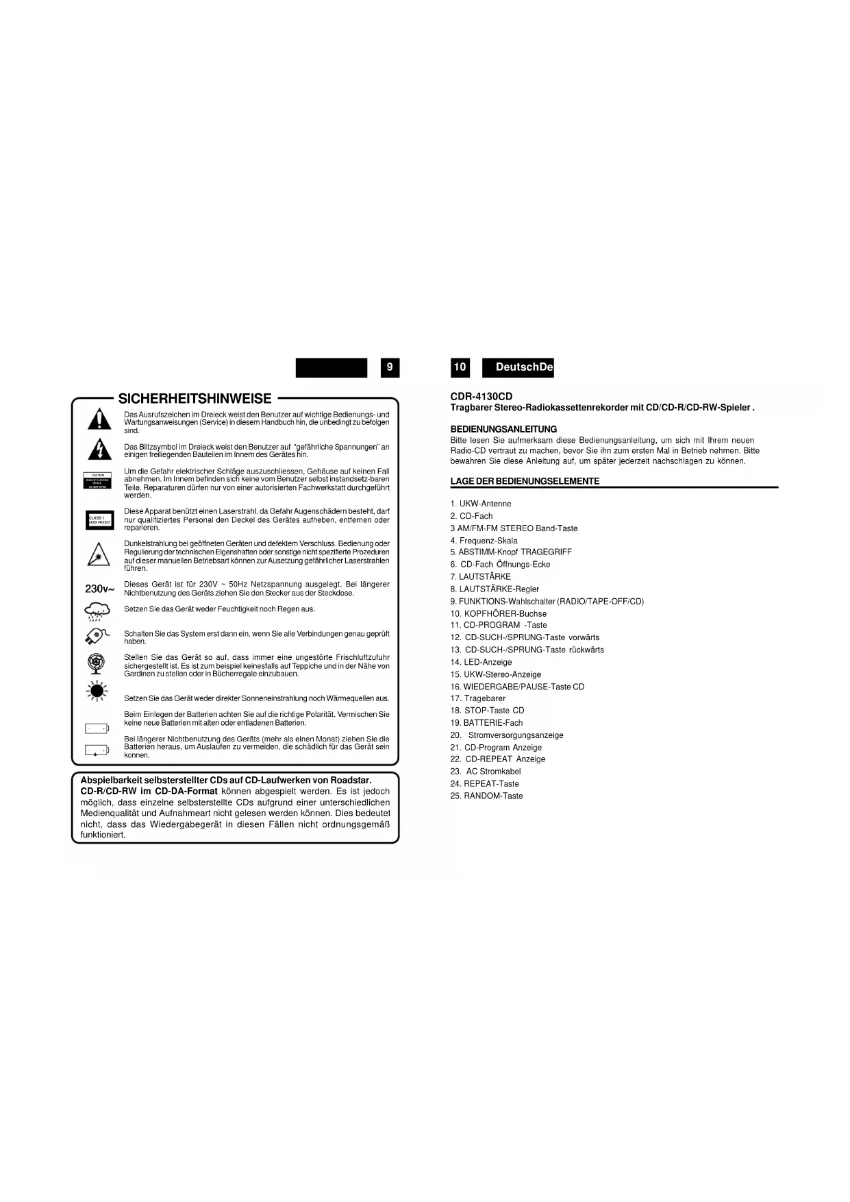 1. UKW-Antenne2. CD-Fach3 AM/FM-FM STEREO Band-Taste4. Frequenz-Skala5. ABSTIMM-Knopf TRAGEGRIFF6. CD-Fach Öffnungs-Ecke7. LAUTSTÄRKE8. LAUTSTÄRKE-Regler9. FUNKTIONS-Wahlschalter (RADIO/TAPE-OFF/CD)10. KOPFHÖRER-Buchse11. CD-PROGRAM -Taste12. CD-SUCH-/SPRUNG-Taste vorwärts13. CD-SUCH-/SPRUNG-Taste rückwärts14. LED-Anzeige15. UKW-Stereo-Anzeige16. WIEDERGABE/PAUSE-Taste CD17. Tragebarer18. STOP-Taste CD19. BATTERIE-Fach20. Stromversorgungsanzeige21. CD-Program Anzeige22. CD-REPEAT Anzeige23. AC Stromkabel24. REPEAT-Taste25. RANDOM-Taste SICHERHEITSHINWEISE