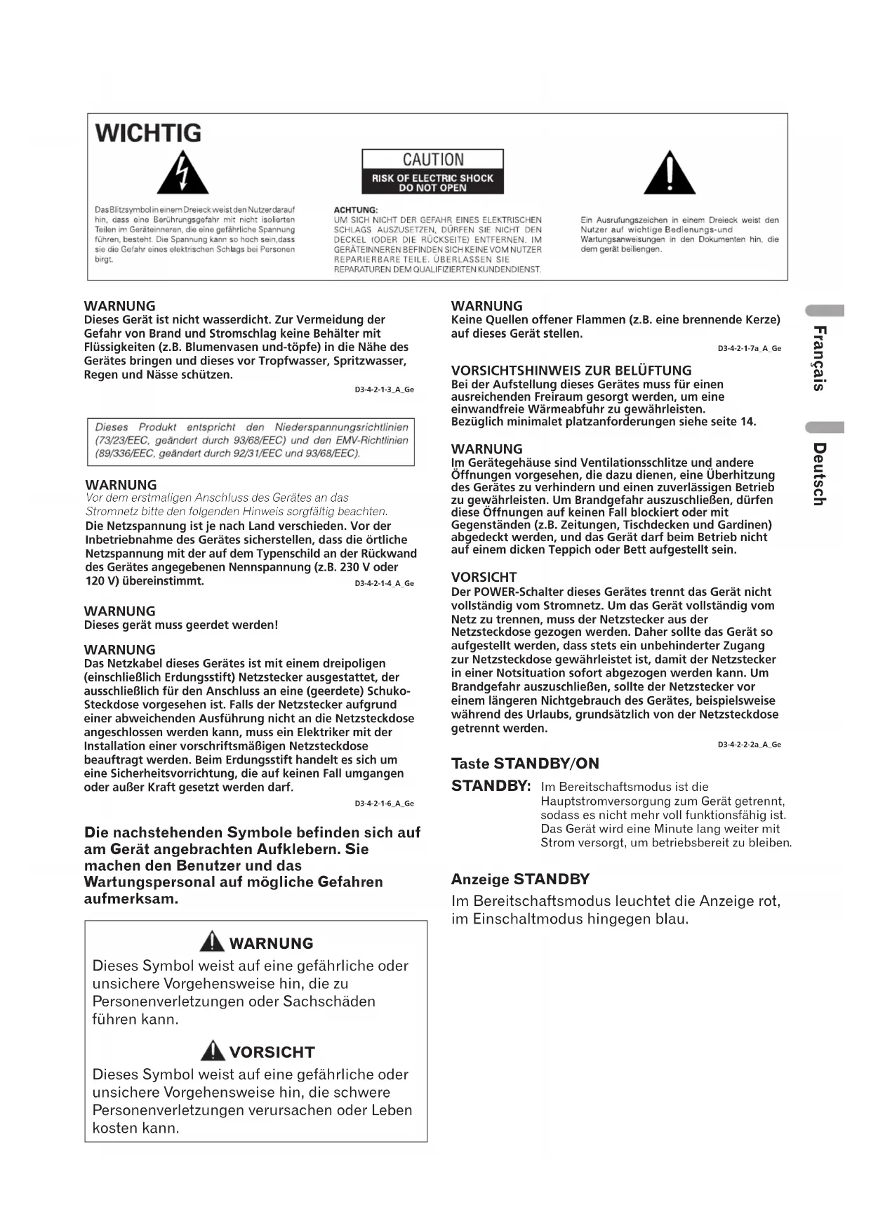 WARNUNG Dieses gerät muss geerdet werden! WARNUNG Das Netzkabel dieses Gerätes ist mit einem dreipoligen (einschließlich Erdungsstift) Netzstecker ausgestattet, der ausschließlich für den Anschluss an eine (geerdete) Schuko-Steckdose vorgesehen ist. Falls der Netzstecker aufgrund einer abweichenden Ausführung nicht an die Netzsteckdose angeschlossen werden kann, muss ein Elektriker mit der Installation einer vorschriftsmäßigen Netzsteckdose beauftragt werden. Beim Erdungsstift handelt es sich um eine Sicherheitsvorrichtung, die auf keinen Fall umgangen oder außer Kraft gesetzt werden darf. D3-4-2-1-6_A_Ge