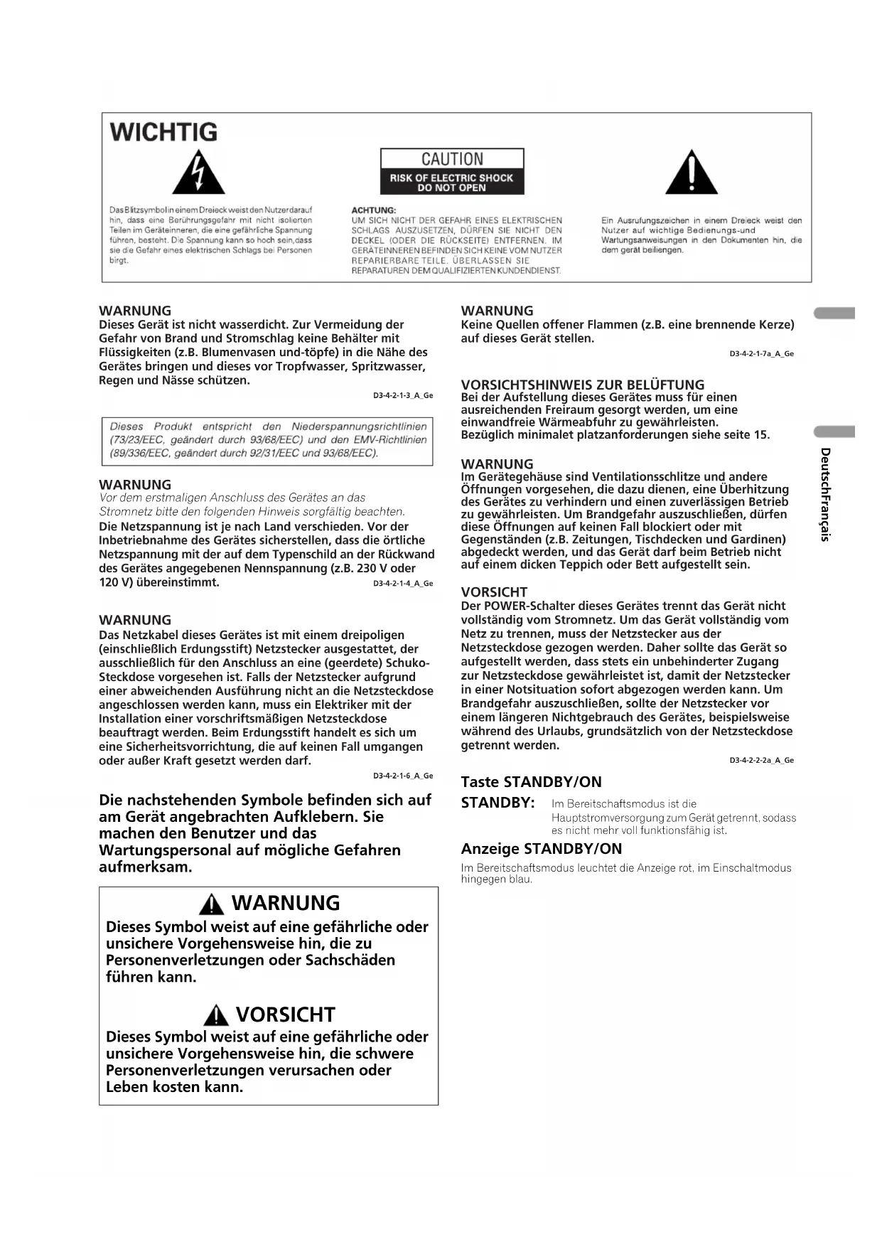WARNUNG Dieses Gerät ist nicht wasserdicht. Zur Vermeidung der Gefahr von Brand und Stromschlag keine Behälter mit Flüssigkeiten (z.B. Blumenvasen und-töpfe) in die Nähe des Gerätes bringen und dieses vor Tropfwasser, Spritzwasser, Regen und Nässe schützen.D3-4-2-1-3_A_Ge WARNUNG Die Netzspannung ist je nach Land verschieden. Vor der Inbetriebnahme des Gerätes sicherstellen, dass die örtliche Netzspannung mit der auf dem Typenschild an der Rückwand des Gerätes angegebenen Nennspannung (z.B. 230 V oder 120 V) übereinstimmt.D3-4-2-1-4_A_Ge Vor dem erstmaligen Anschluss des Gerätes an das