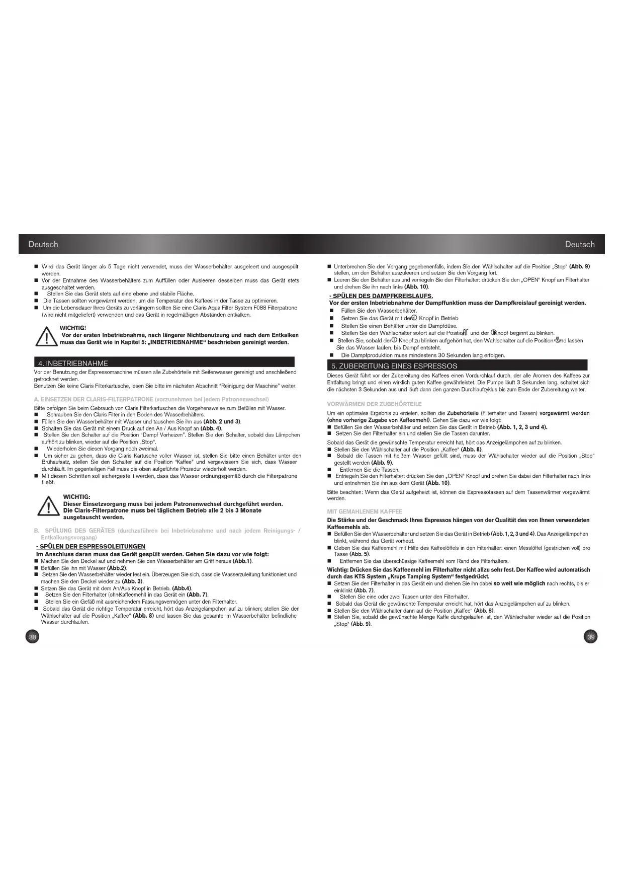 Das Kaffeepad wurde nicht richtig in den Filterhalter eingesetzt.Setzen Sie den Filterhalter ein und verriegeln Sie ihn (drehen Sie ihn so weit wie möglich nach rechts, bis er einklinkt).Entfernen Sie das überschüssige Kaffeemehl. Achten Sie darauf, dass sich das gesamte Papier im Inneren des Filterhalters befindet.Ihr Espresso schmeckt nicht gut.Das Gerät wurde nach dem Entkalken nicht richtig durchgespült.Entkalken Sie das Gerät gemäß der Gebrauchsanleitung (siehe Kapitel 9).Das Gerät funktioniert nicht.Die Pumpe funktioniert nicht, weil sich zu wenig Wasser im Wasserbehälter befindet.Der abnehmbare Wasserbehälter wurde nicht richtig eingesetzt.Die Claris-Patrone wurde gewechselt, aber nicht korrekt in Betrieb genommen.Füllen Sie den Wasserbehälter auf und setzen Sie die Pumpe in Betrieb (Siehe Kapitel 5). Vermeiden Sie es, den Wasserbehälter vollkommen leer zu machen.Setzen Sie den Wasserbehälter ein und drücken Sie ihn fest nach unten. Siehe Kapitel 5.Die Dampfdüse schäumt die Milch nicht auf.Die Dampfdüse ist verschmutzt oder verkalkt.Die Milch ist zu heiß.Die Form des Gefäßes ist ungeeignet.Sie verwenden entrahmte Milch.Entkalken Sie die Dampfdüse (siehe Kapitel 9) oder entfernen Sie den Stopfen mit einer Nadel.Verwenden Sie kalte Milch.Verwenden Sie ein kleines Kännchen. Verwenden Sie vorzugsweise Vollmilch oder halbentrahmte Milch. Probleme Mögliche Ursachen Lösungen Es tritt Wasser unter der Tropfenauffangschale aus. Vorhandenes oder austretendes Wasser kann bei der Entnahme der Tropfenauffangschale auftreten. Dies ist kein Anzeichen für eine Undichtigkeit.Im Filterhalter sind knackende Geräusche zu hören.Dieses Phänomen ist normal: es handelt sich um die Sicherheitsblockierung des Filterhalters.Die Pumpe gibt ungewöhnlich laute Geräusche von sich.Es befindet sich kein Wasser im Wasserbehälter.Der Wasserbehälter wurde nicht korrekt eingesetztSchalten Sie das Gerät aus, füllen Sie den Wasserbehälter auf und setzen Sie das Gerät wieder in Betrieb.Drücken Sie den Wasserbehälter fest nach unten.Die Tassen werden nicht gleichmäßig hoch gefüllt.Der Filterhalter ist verschmutzt. Siehe Kapitel 8. Deutsch Deutsch4746