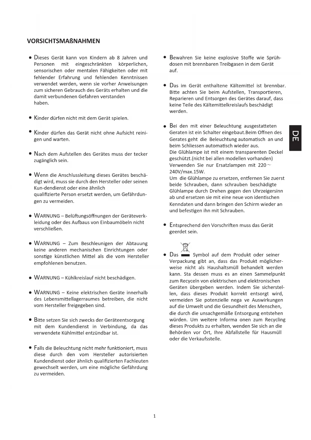 Das im Gerät enthaltene Kältemiel ist brennbar.