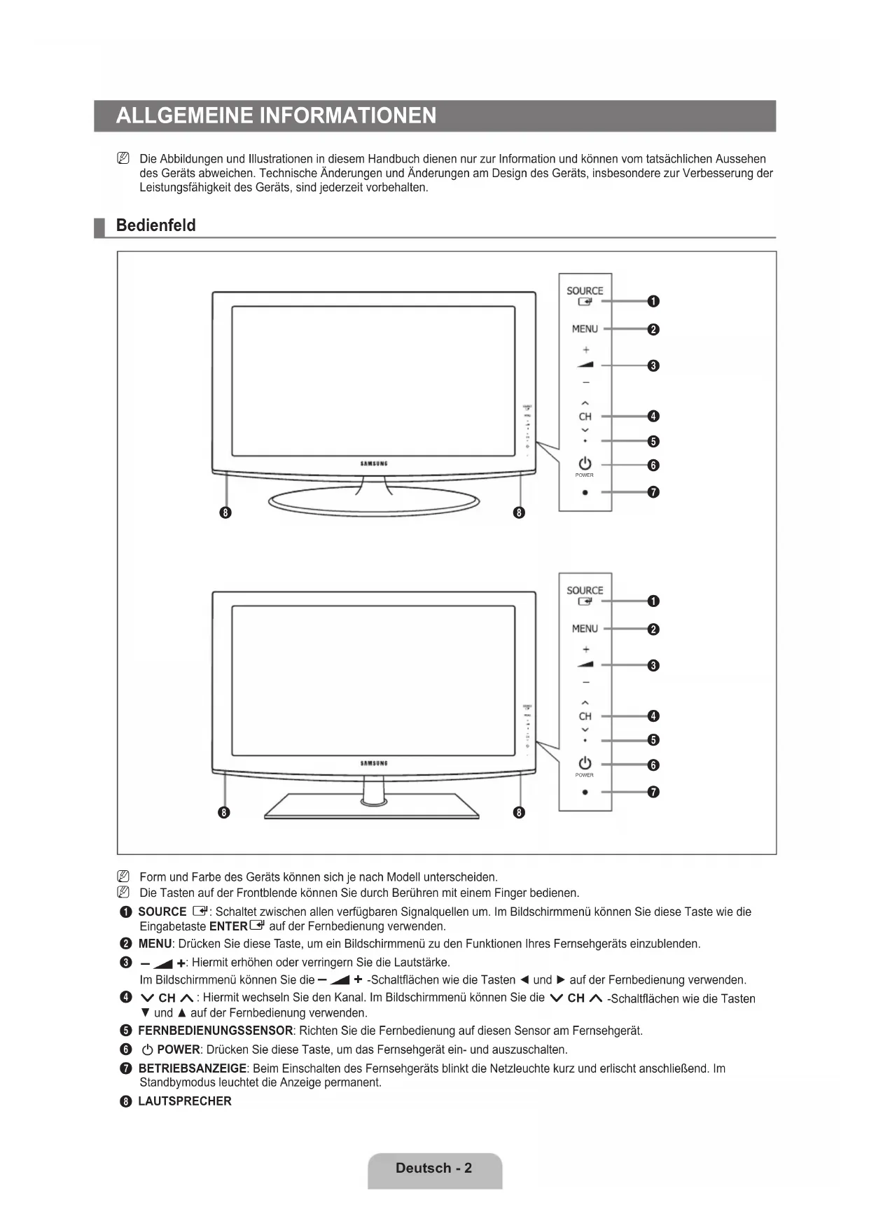 ALLGEMEINE INFORMATIONEN Bedienfeld 2 Zubehör 3 Anschlussfeld 4 Fernbedienung 6 Batterien in die Fernbedienung einsetzen 6 BEDIENUNG Anzeigen von Menüs 7Fernsehgerät in den Standby-Modus schalten 8 Plug & Play-Funktion 8
