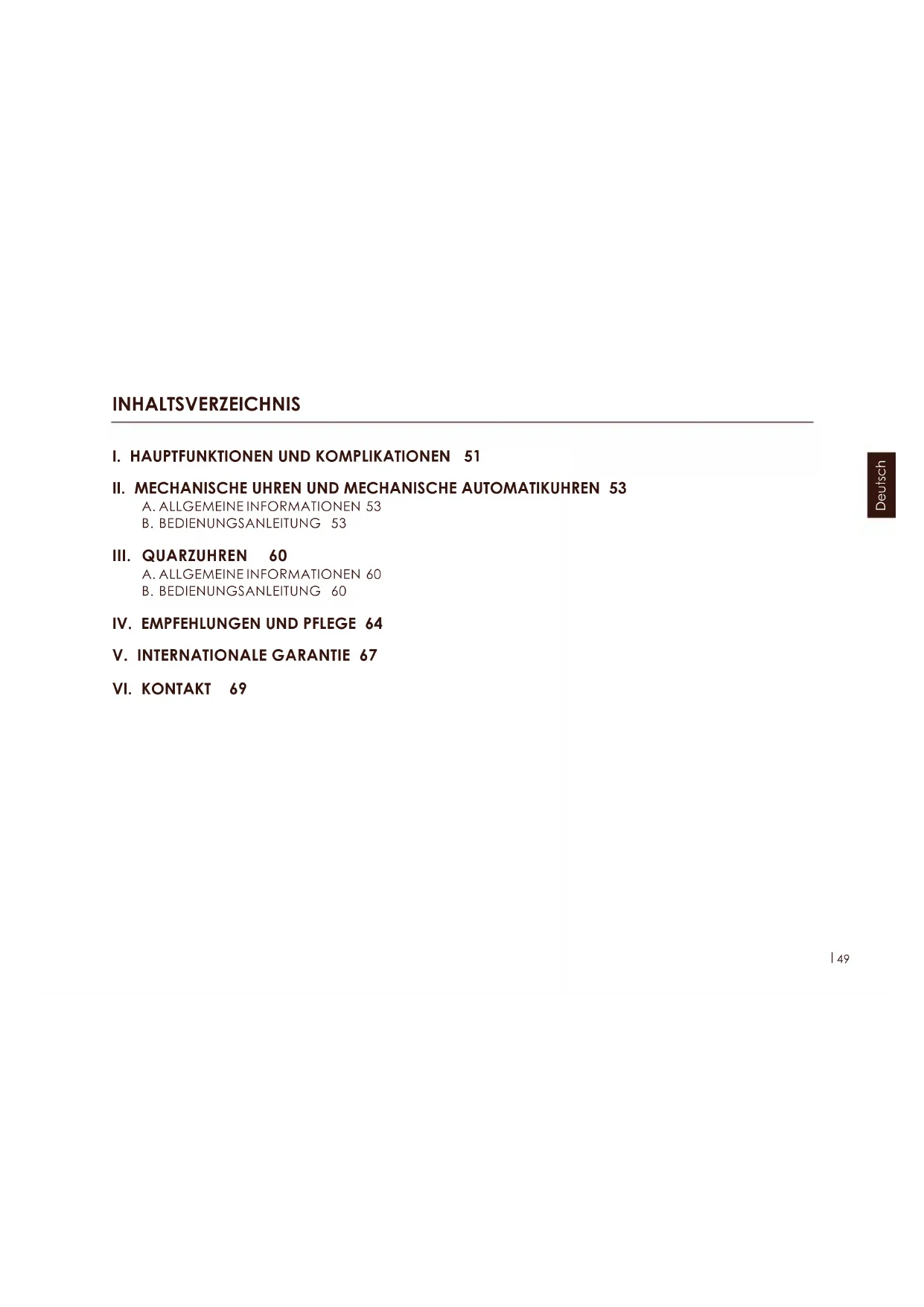 Das Gehäuse und Metallarmband Zum Erhalt des Glanzes Ihrer Uhr und des Metallarmbands empfehlen wir, sie sanft mit einer weichen Bürste (z.B. Zahnbürste) und lauwarmem Seifenwasser abzubürsten. Danach spülen Sie Ihre Uhr vorsichtig mit destilliertem Wasser ab und trocknen Sie sie mit einem weichen Tuch. Der gleiche Vorgang wird nach einem Bad im Meer oder einem Schwimmbadbesuch empfohlen. Stellen Sie vor jeder Reinigung sicher, dass sich die Krone Ihrer Uhr in der richtigen Position befindet (je nach Modell gedrückt oder geschraubt). Das Lederarmband Die Haltbarkeit eines Lederarmbands hängt von den Umständen und der Häufigkeit des Tragens ab. Um es so lange wie möglich in gutem Zustand zu erhalten, empfehlen wir, den Kontakt mit Wasser, Feuchtigkeit, fetthaltigen Stoffen, Kosmetikprodukten sowie längere Sonneneinstrahlung zu vermeiden. Das Kautschukarmband Die Haltbarkeit eines Kautschukarmbands hängt von den äußeren Einflüssen und der Häufigkeit des Tragens ab. Um es so lange wie möglich in gutem Zustand zu erhalten, empfehlen wir, den Kontakt mit fetthaltigen Stoffen, Kosmetikprodukten sowie längere Sonneneinstrahlung oder jede andere Hitzequelle zu vermeiden. Sie können Ihr Kautschukarmband mit Seifenwasser reinigen. 001-224_COR2.indd 65 06.01.15 10:4666