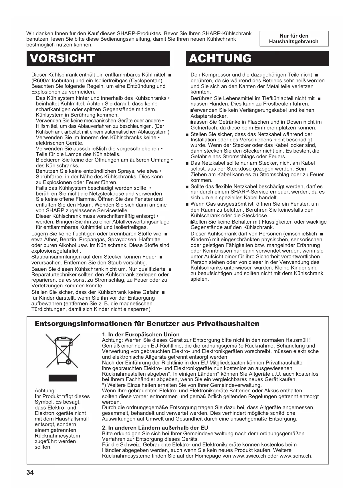 (B191)-West.indb 5 2011/03/14 13:13:4034 Nur für den Haushaltsgebrauch Wir danken Ihnen für den Kauf dieses SHARP-Produktes. Bevor Sie Ihren SHARP-Kühlschrank benutzen, lesen Sie bitte diese Bedienungsanleitung, damit Sie Ihren neuen Kühlschrank bestmöglich nutzen können. Dieser Kühlschrank enthält ein entammbares Kühlmittel ■ (R600a: Isobutan) und ein Isoliertreibgas (Cyclopentan). Beachten Sie folgende Regeln, um eine Entzündung und Explosionen zu vermeiden. Das Kühlsystem hinter und innerhalb des Kühlschranks • beinhaltet Kühlmittel. Achten Sie darauf, dass keine scharfkantigen oder spitzen Gegenstände mit dem Kühlsystem in Berührung kommen. Verwenden Sie keine mechanischen Geräte oder andere • Hilfsmittel, um das Abtauverfahren zu beschleunigen. (Der Kühlschrank arbeitet mit einem automatischen Abtausystem.) Verwenden Sie im Inneren des Kühlschranks keine • elektrischen Geräte. Verwenden Sie ausschließlich die vorgeschriebenen • Teile für die Lampe des Kühlabteils. Blockieren Sie keine der Öffnungen am äußeren Umfang • des Kühlschranks. Benutzen Sie keine entzündlichen Sprays, wie etwa • Sprühfarbe, in der Nähe des Kühlschranks. Dies kann zu Explosionen oder Feuer führen. Falls das Kühlsystem beschädigt werden sollte, • berühren Sie nicht die Netzsteckdose und verwenden Sie keine offene Flamme. Öffnen Sie das Fenster und entlüften Sie den Raum. Wenden Sie sich dann an eine von SHARP zugelassene Servicestelle. Dieser Kühlschrank muss vorschriftsmäßig entsorgt • werden. Bringen Sie ihn zu einer Abfallverwertungsanlage für entammbares Kühlmittel und Isoliertreibgas. Lagern Sie keine üchtigen oder brennbaren Stoffe wie ■ etwa Äther, Benzin, Propangas, Spraydosen, Haftmittel oder puren Alkohol usw. im Kühlschrank. Diese Stoffe sind explosionsgefährlich. Staubansammlungen auf dem Stecker können Feuer ■ verursachen. Entfernen Sie den Staub vorsichtig. Bauen Sie diesen Kühlschrank nicht um. Nur qualizierte ■ Reparaturtechniker sollten den Kühlschrank zerlegen oder reparieren, da es sonst zu Stromschlag, zu Feuer oder zu Verletzungen kommen könnte. Stellen Sie sicher, dass der Kühlschrank keine Gefahr ■ für Kinder darstellt, wenn Sie ihn vor der Entsorgung aufbewahren (entfernen Sie z. B. die magnetischen Türdichtungen, damit sich Kinder nicht einsperren). VORSICHT ACHTUNG Den Kompressor und die dazugehörigen Teile nicht ■ berühren, da sie während des Betriebs sehr heiß werden und Sie sich an den Kanten der Metallteile verletzen könnten. Berühren Sie Lebensmittel im Tiefkühlabteil nicht mit ■ nassen Händen. Dies kann zu Frostbeulen führen. Verwenden Sie kein Verlängerungskabel und keinen ■ Adapterstecker. Lassen Sie Getränke in Flaschen und in Dosen nicht im ■ Gefrierfach, da diese beim Einfrieren platzen können. Stellen Sie sicher, dass das Netzkabel während der ■ Installation oder des Verschiebens nicht beschädigt wurde. Wenn der Stecker oder das Kabel locker sind, dann stecken Sie den Stecker nicht ein. Es besteht die Gefahr eines Stromschlags oder Feuers. Das Netzkabel sollte nur am Stecker, nicht am Kabel ■ selbst, aus der Steckdose gezogen werden. Beim Ziehen am Kabel kann es zu Stromschlag oder zu Feuer kommen. Sollte das exible Netzkabel beschädigt werden, darf es ■ nur durch einem SHARP-Service erneuert werden, da es sich um ein spezielles Kabel handelt. Wenn Gas ausgeströmt ist, öffnen Sie ein Fenster, um ■ den Raum zu belüften. Berühren Sie keinesfalls den Kühlschrank oder die Steckdose. Stellen Sie keine Behälter mit Flüssigkeiten oder wacklige ■ Gegenstände auf den Kühlschrank. Dieser Kühlschrank darf von Personen (einschließlich ■ Kindern) mit eingeschränkten physischen, sensorischen oder geistigen Fähigkeiten bzw. mangelnder Erfahrung oder Kenntnissen nur dann verwendet werden, wenn sie unter Aufsicht einer für ihre Sicherheit verantwortlichen Person stehen oder von dieser in der Verwendung des Kühlschranks unterwiesen wurden. Kleine Kinder sind zu beaufsichtigen und sollten nicht mit dem Kühlschrank spielen. Entsorgungsinformationen für Benutzer aus Privathaushalten