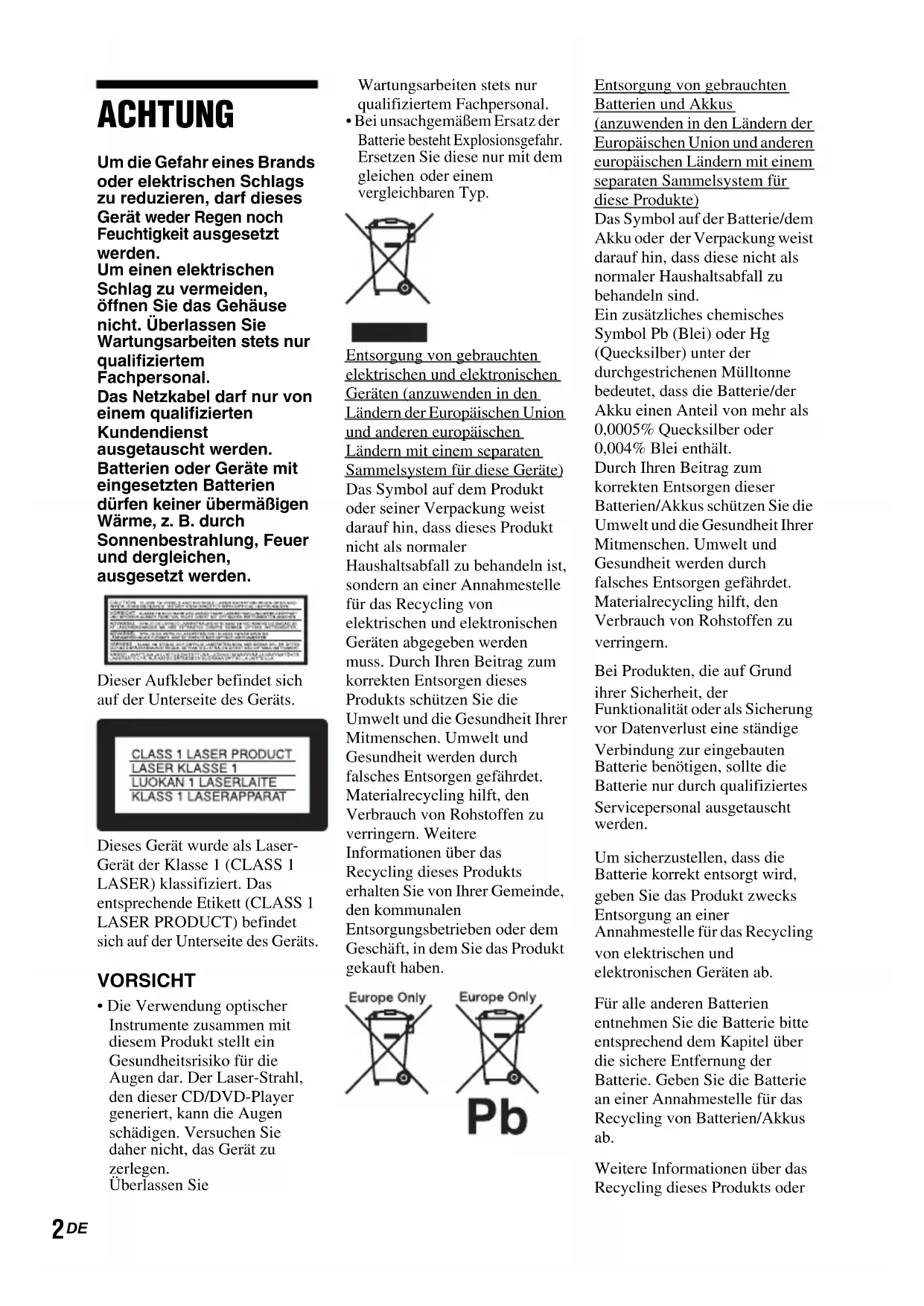 DE ACHTUNG Um die Gefahr eines Brands