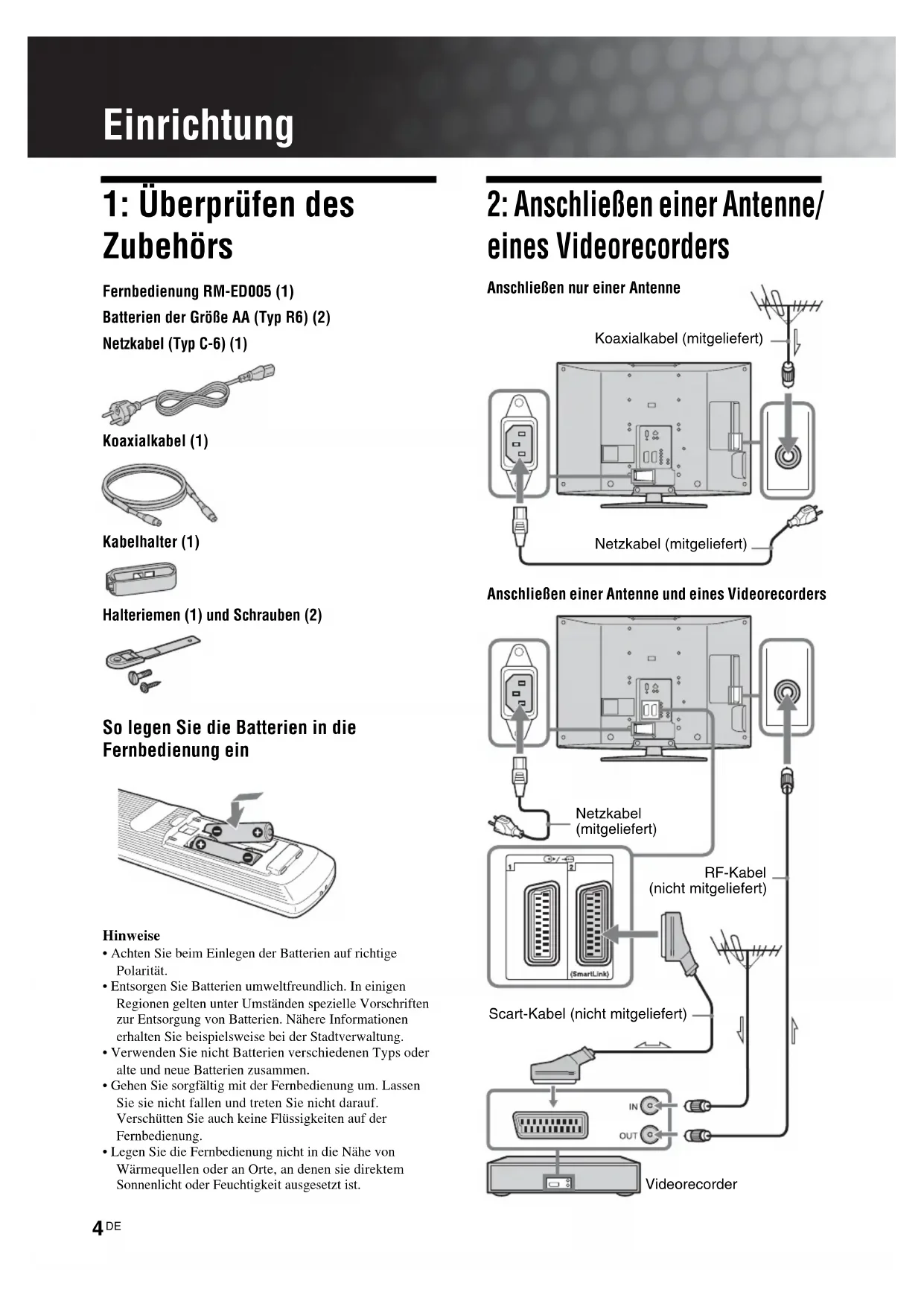 Fernbedienung ein Hinweise• Achten Sie beim Einlegen der Batterien auf richtige Polarität.• Entsorgen Sie Batterien umweltfreundlich. In einigen Regionen gelten unter Umständen spezielle Vorschriften zur Entsorgung von Batterien. Nähere Informationen erhalten Sie beispielsweise bei der Stadtverwaltung.• Verwenden Sie nicht Batterien verschiedenen Typs oder alte und neue Batterien zusammen.• Gehen Sie sorgfältig mit der Fernbedienung um. Lassen Sie sie nicht fallen und treten Sie nicht darauf. Verschütten Sie auch keine Flüssigkeiten auf der Fernbedienung.• Legen Sie die Fernbedienung nicht in die Nähe von Wärmequellen oder an Orte, an denen sie direktem Sonnenlicht oder Feuchtigkeit ausgesetzt ist. 2: Anschließen einer Antenne/