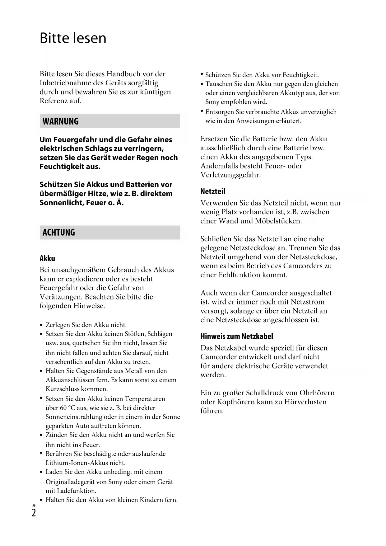 folgenden Hinweise. Zerlegen Sie den Akku nicht.Setzen Sie den Akku keinen Stößen, Schlägen usw. aus, quetschen Sie ihn nicht, lassen Sie ihn nicht fallen und achten Sie darauf, nicht versehentlich auf den Akku zu treten.Halten Sie Gegenstände aus Metall von den Akkuanschlüssen fern. Es kann sonst zu einem Kurzschluss kommen.Setzen Sie den Akku keinen Temperaturen über 60 °C aus, wie sie z. B. bei direkter Sonneneinstrahlung oder in einem in der Sonne geparkten Auto auftreten können.Zünden Sie den Akku nicht an und werfen Sie ihn nicht ins Feuer.Berühren Sie beschädigte oder auslaufende Lithium-Ionen-Akkus nicht.Laden Sie den Akku unbedingt mit einem Originalladegerät von Sony oder einem Gerät mit Ladefunktion.Halten Sie den Akku von kleinen Kindern fern.