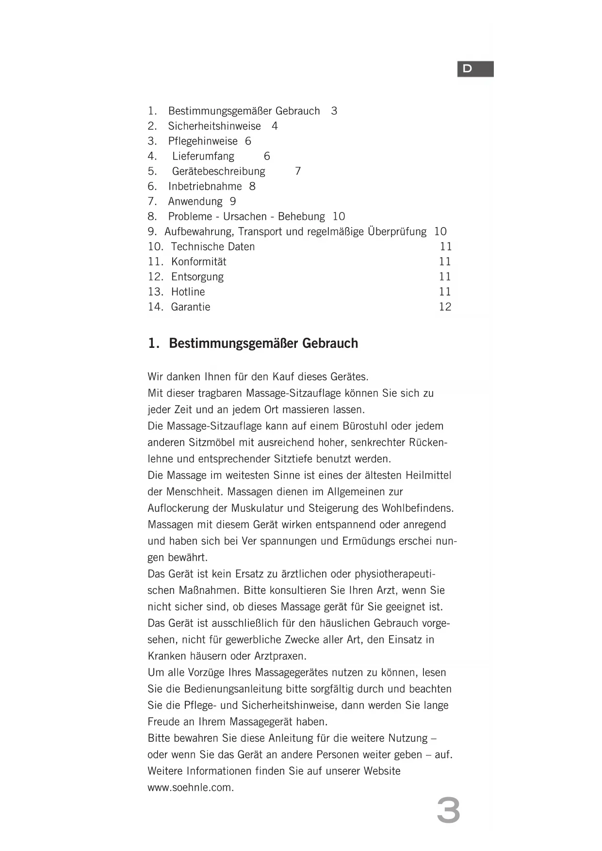 Wir danken Ihnen für den Kauf dieses Gerätes. Mit dieser tragbaren Massage-Sitzauflage können Sie sich zu jeder Zeit und an jedem Ort massieren lassen. Die Massage-Sitzauflage kann auf einem Bürostuhl oder jedem anderen Sitzmöbel mit ausreichend hoher, senkrechter Rücken- lehne und entsprechender Sitztiefe benutzt werden. Die Massage im weitesten Sinne ist eines der ältesten Heilmittel der Menschheit. Massagen dienen im Allgemeinen zur Auflockerung der Muskulatur und Steigerung des Wohlbefindens. Massagen mit diesem Gerät wirken entspannend oder anregend und haben sich bei Ver spannungen und Ermüdungs erschei nun- gen bewährt. Das Gerät ist kein Ersatz zu ärztlichen oder physiotherapeuti- schen Maßnahmen. Bitte konsultieren Sie Ihren Arzt, wenn Sie nicht sicher sind, ob dieses Massage gerät für Sie geeignet ist. Das Gerät ist ausschließlich für den häuslichen Gebrauch vorge- sehen, nicht für gewerbliche Zwecke aller Art, den Einsatz in Kranken häusern oder Arztpraxen. Um alle Vorzüge Ihres Massagegerätes nutzen zu können, lesen Sie die Bedienungsanleitung bitte sorgfältig durch und beachten Sie die Pflege- und Sicherheitshinweise, dann werden Sie lange Freude an Ihrem Massagegerät haben. Bitte bewahren Sie diese Anleitung für die weitere Nutzung – oder wenn Sie das Gerät an andere Personen weiter geben – auf. Weitere Informationen finden Sie auf unserer Website www.soehnle.com.