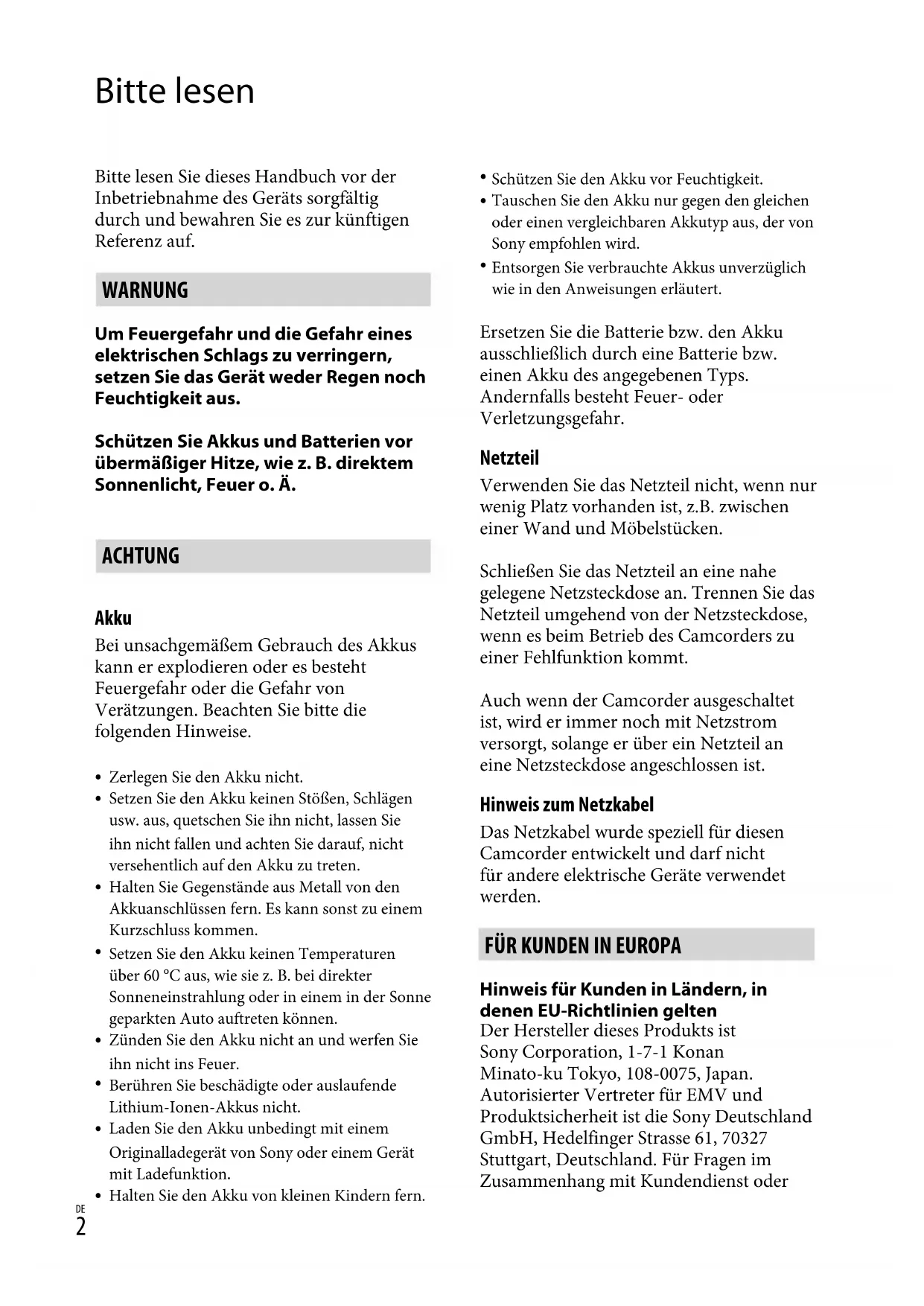 Schützen Sie den Akku vor Feuchtigkeit.Tauschen Sie den Akku nur gegen den gleichen oder einen vergleichbaren Akkutyp aus, der von Sony empfohlen wird.Entsorgen Sie verbrauchte Akkus unverzüglich wie in den Anweisungen erläutert. Ersetzen Sie die Batterie bzw. den Akku