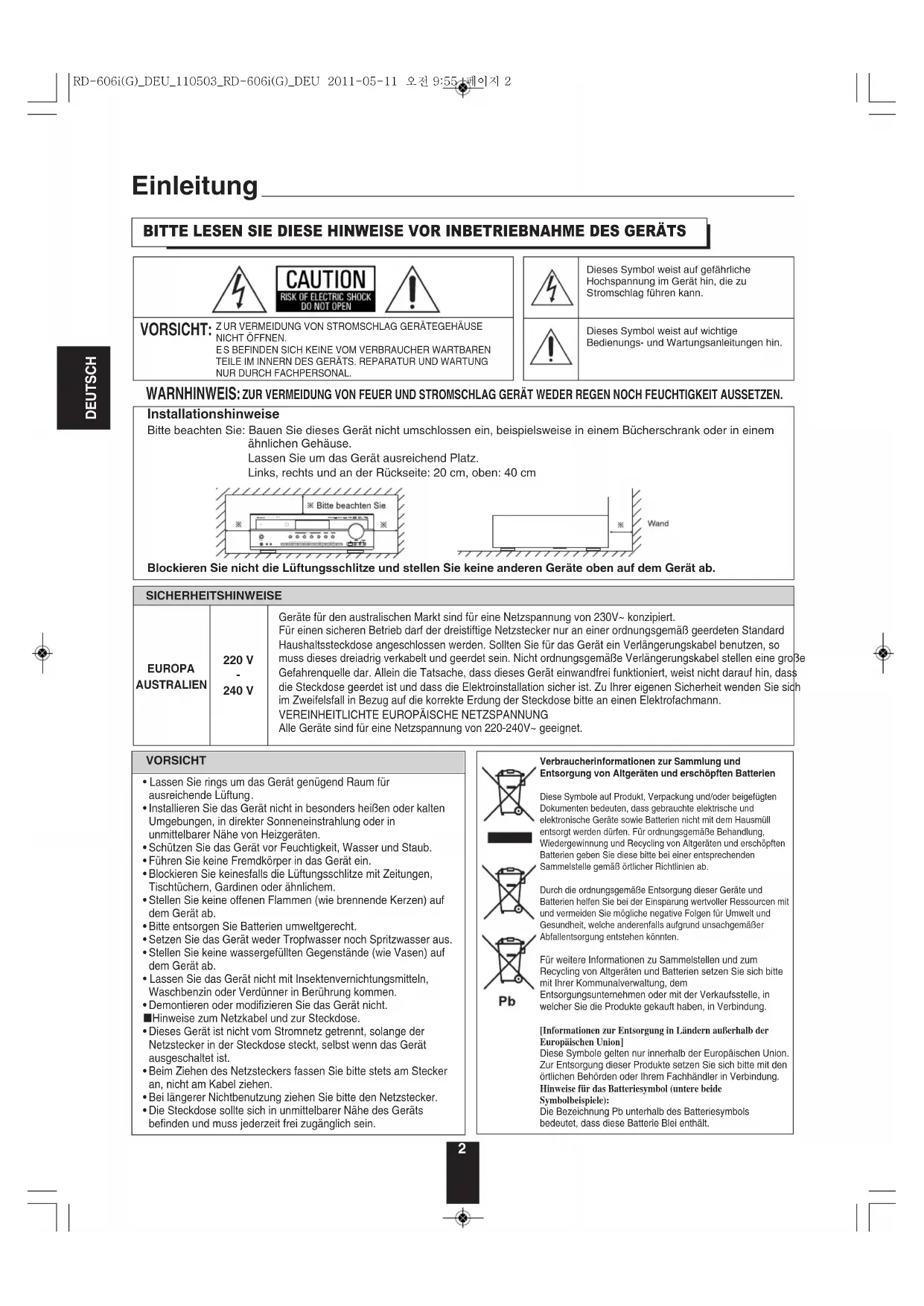 Demontieren oder modifizieren Sie das Gerät nicht.¢ Hinweise zum Netzkabel und zur Steckdose. Dieses Gerät ist nicht vom Stromnetz getrennt, solange derNetzstecker in der Steckdose steckt, selbst wenn das Gerätausgeschaltet ist. Beim Ziehen des Netzsteckers fassen Sie bitte stets am Steckeran, nicht am Kabel ziehen. Bei längerer Nichtbenutzung ziehen Sie bitte den Netzstecker. Die Steckdose sollte sich in unmittelbarer Nähe des Gerätsbefinden und muss jederzeit frei zugänglich sein.Verbraucherinformationen zur Sammlung undEntsorgung von Altgeräten und erschöpften BatterienDiese Symbole auf Produkt, Verpackung und/oder beigefügtenDokumenten bedeuten, dass gebrauchte elektrische undelektronische Geräte sowie Batterien nicht mit dem Hausmüllentsorgt werden dürfen. Für ordnungsgemäße Behandlung,Wiedergewinnung und Recycling von Altgeräten und erschöpftenBatterien geben Sie diese bitte bei einer entsprechendenSammelstelle gemäß örtlicher Richtlinien ab.Durch die ordnungsgemäße Entsorgung dieser Geräte undBatterien helfen Sie bei der Einsparung wertvoller Ressourcen mitund vermeiden Sie mögliche negative Folgen für Umwelt undGesundheit, welche anderenfalls aufgrund unsachgemäßerAbfallentsorgung entstehen könnten.Für weitere Informationen zu Sammelstellen und zumRecycling von Altgeräten und Batterien setzen Sie sich bittemit Ihrer Kommunalverwaltung, demEntsorgungsunternehmen oder mit der Verkaufsstelle, inwelcher Sie die Produkte gekauft haben, in Verbindung.[Informationen zur Entsorgung in Ländern außerhalb derEuropäischen Union]Diese Symbole gelten nur innerhalb der Europäischen Union.Zur Entsorgung dieser Produkte setzen Sie sich bitte mit denörtlichen Behörden oder Ihrem Fachhändler in Verbindung.Hinweise für das Batteriesymbol (untere beideSymbolbeispiele):Die Bezeichnung Pb unterhalb des Batteriesymbolsbedeutet, dass diese Batterie Blei enthält. Einleitung ZUR VERMEIDUNG VON FEUER UND STROMSCHLAG GERÄT WEDER REGEN NOCH FEUCHTIGKEIT AUSSETZEN. Dieses Symbol weist auf gefährliche ochspannung im Gerät hin, die zu tromschlag führen kann.Dieses Symbol weist auf wichtigeBedienungs- und Wartungsanleitungen hin. Installationshinweise Bitte beachten Sie: Bauen Sie dieses Gerät nicht umschlossen ein, beispielsweise in einem Bücherschrank oder in einemähnlichen Gehäuse.Lassen Sie um das Gerät ausreichend Platz.Links, rechts und an der Rückseite: 20 cm, oben: 40 cmBlockieren Sie nicht die Lüftungsschlitze und stellen Sie keine anderen Geräte oben auf dem Gerät ab. UR VERMEIDUNG VON STROMSCHLAG GERÄTEGEHÄUSENICHT ÖFFNEN. S BEFINDEN SICH KEINE VOM VERBRAUCHER WARTBARENTEILE IM INNERN DES GERÄTS. REPARATUR UND WARTUNGNUR DURCH FACHPERSONAL. VORSICHT: WARNHINWEIS: BITTE LESEN SIE DIESE HINWEISE VOR INBETRIEBNAHME DES GERÄTS
