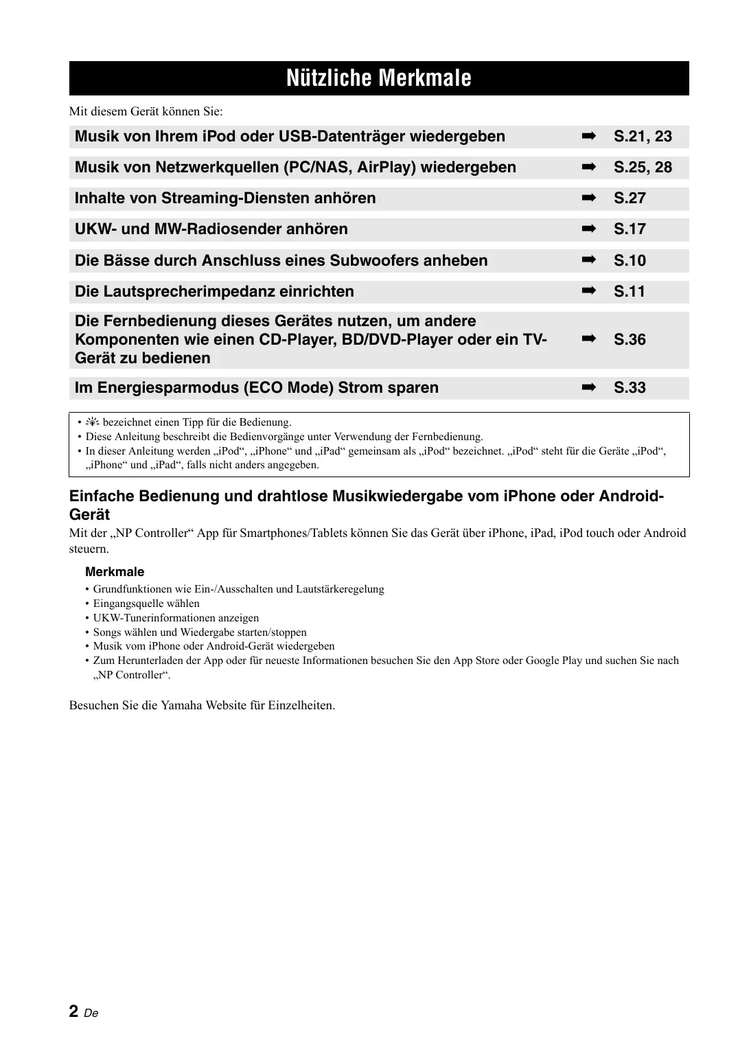 Einfache Bedienung und drahtlose Musikwiedergabe vom iPhone oder AndroidGerät Mit der „NP Controller“ App für Smartphones/Tablets können Sie das Gerät über iPhone, iPad, iPod touch oder Android steuern. Merkmale • • • • • •