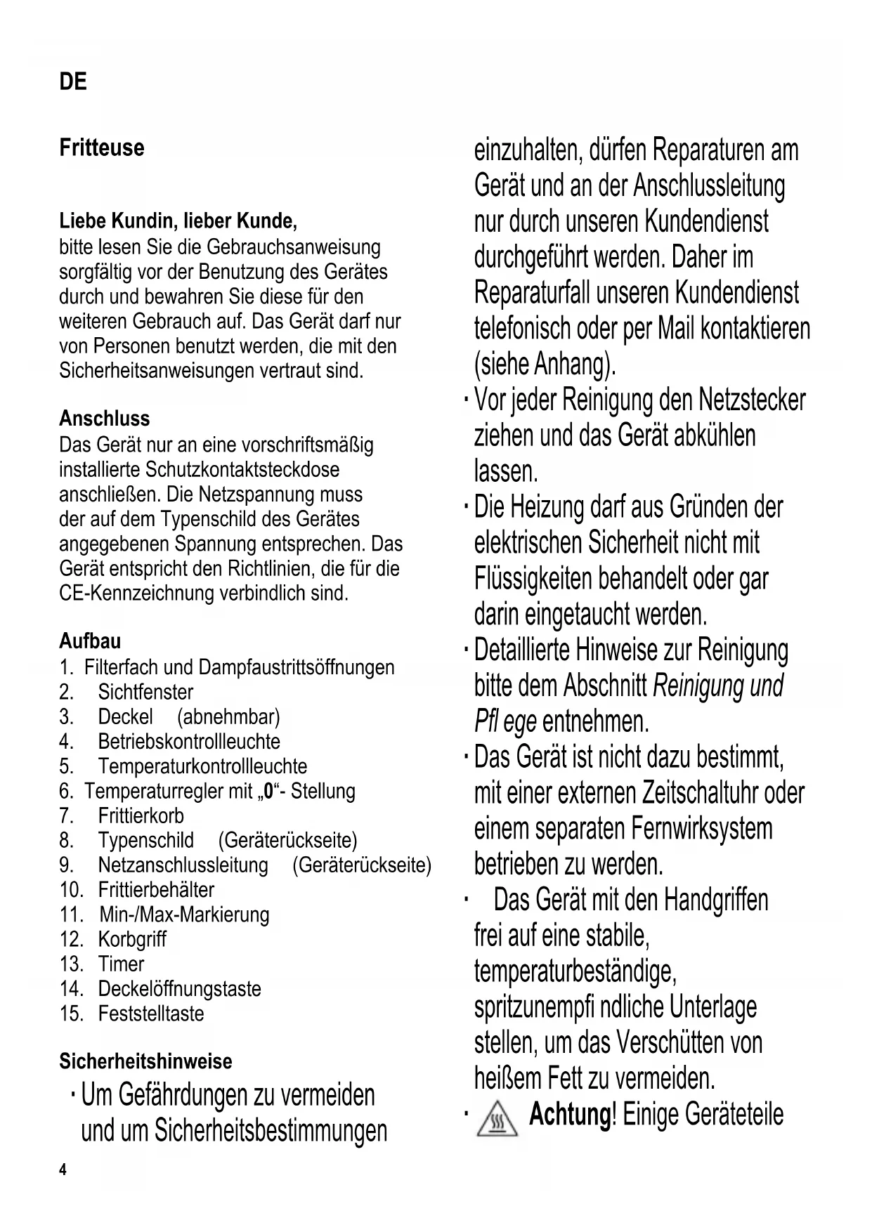Fritteuse Liebe Kundin, lieber Kunde, bitte lesen Sie die Gebrauchsanweisung sorgfältig vor der Benutzung des Gerätes durch und bewahren Sie diese für den weiteren Gebrauch auf. Das Gerät darf nur von Personen benutzt werden, die mit den Sicherheitsanweisungen vertraut sind. Anschluss Das Gerät nur an eine vorschriftsmäßig installierte Schutzkontaktsteckdose anschließen. Die Netzspannung muss der auf dem Typenschild des Gerätes angegebenen Spannung entsprechen. Das Gerät entspricht den Richtlinien, die für die CE-Kennzeichnung verbindlich sind. Aufbau