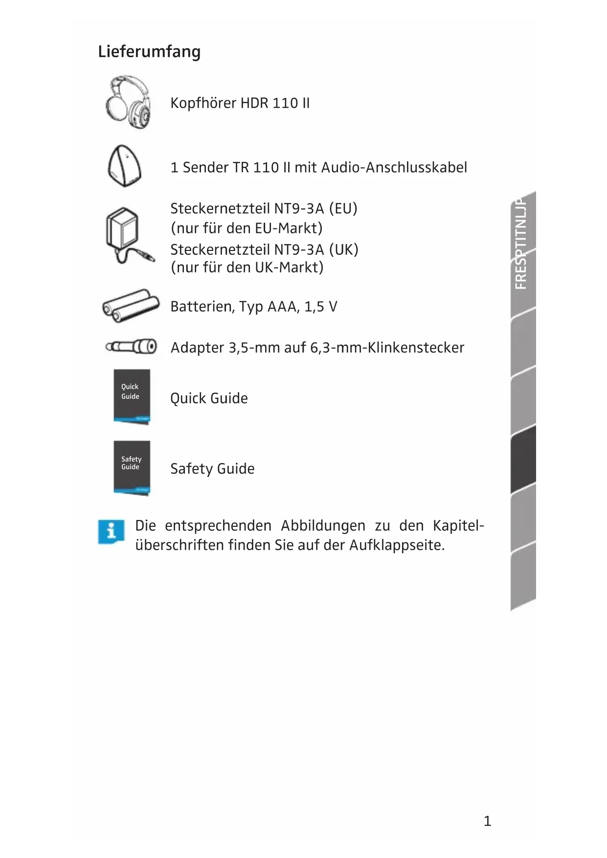 Lieferumfang Kopfhörer HDR 110 II 1 Sender TR 110 II mit Audio-Anschlusskabel Steckernetzteil NT9-3A (EU) (nur für den EU-Markt) Steckernetzteil NT9-3A (UK) (nur für den UK-Markt) Batterien, Typ AAA, 1,5 V Adapter 3,5-mm auf 6,3-mm-Klinkenstecker Quick Guide Quick Guide Safety Guide Safety Guide Die entsprechenden Abbildungen zu den Kapitel- überschriften finden Sie auf der Aufklappseite.2 Sender für den Gebrauch vorbereiten