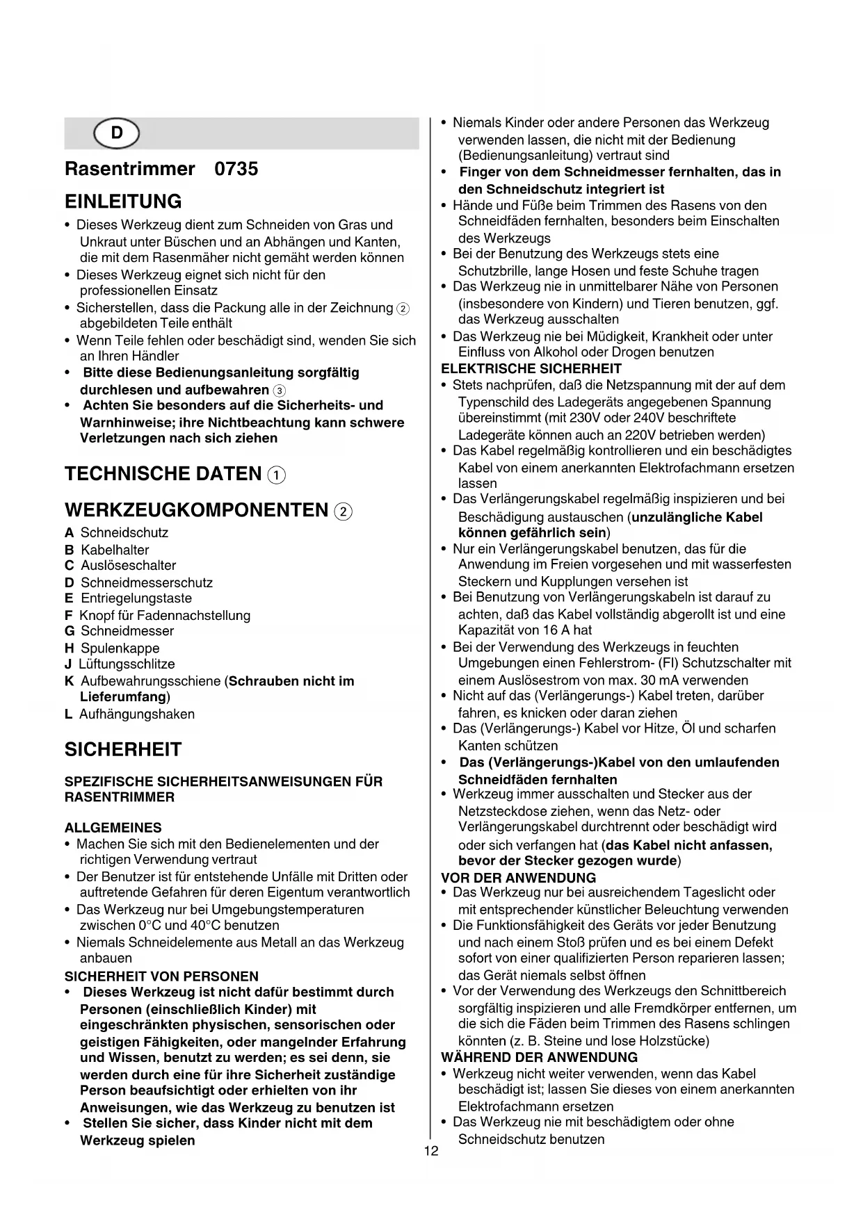 - AchtenSiebesondersaufdieSicherheits-und Warnhinweise;ihreNichtbeachtungkannschwere Verletzungennachsichziehen TECHNISCHE DATEN 1 WERKZEUGKOMPONENTEN2 A Schneidschutz B Kabelhalter C Auslöseschalter D Schneidmesserschutz E Entriegelungstaste F Knopf für Fadennachstellung G Schneidmesser H Spulenkappe J Lüftungsschlitze K Aufbewahrungsschiene (Schraubennichtim Lieferumfang) L Aufhängungshaken SICHERHEIT SPEZIFISCHESICHERHEITSANWEISUNGENFÜR RASENTRIMMER ALLGEMEINES