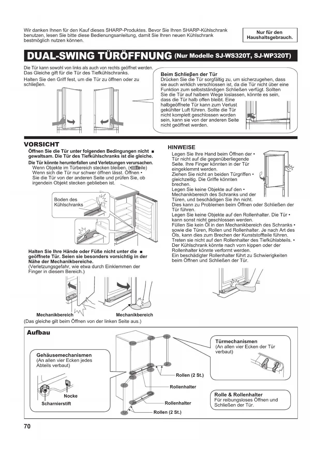 (Nur Modelle SJ-WS320T, SJ-WP320T) Die Tür kann sowohl von links als auch von rechts geöffnet werden.Das Gleiche gift für die Tür des Tiefkühlschranks.Halten Sie den Griff fest, um die Tür zu öffnen oder zu schlieβen. Beim Schlieβen der Tür Drücken Sie die Tür sorgfältig zu, um sicherzugehen, dass sie auch wirklich verschlossen ist, da die Tür nicht über eine Funktion zum selbstständigen Schließen verfügt. Sollten Sie die Tür auf halbem Wege loslassen, könnte es sein, dass die Tür halb offen bleibt. Eine halbgeöffnete Tür kann zum Verlust gekühlter Luft führen. Sollte die Tür nicht komplett geschlossen worden sein, kann sie von der anderen Seite nicht geöffnet werden.(Das gleiche gilt beim Öffnen von der linken Seite aus.) Gehäusemechanismen (An allen vier Ecken jedes Abteils verbaut)RollenhalterRollen (2 St.)Rollen (2 St.)Rollenhalter Türmechanismen (An allen vier Ecken der Tür verbaut) Rolle & Rollenhalter Für reibungsloses Öffnen und Schließen der Tür.Wir danken Ihnen für den Kauf dieses SHARP-Produktes. Bevor Sie Ihren SHARP-Kühlschrank benutzen, lesen Sie bitte diese Bedienungsanleitung, damit Sie Ihren neuen Kühlschrank bestmöglich nutzen können.Boden des KühlschranksMechanikbereichNockeScharnierstiftMechanikbereich(B107)P70-P80_GER.indd 70 2010/09/28 16:53:5471 Dieser Kühlschrank enthält ein entammbares Kühlmittel ■ (R600a: Isobutan) und ein Isoliertreibgas (Cyclopentan). Beachten Sie folgende Regeln, um eine Entzündung und Explosionen zu vermeiden. Das Kühlsystem hinter und innerhalb des Kühlschranks • beinhaltet Kühlmittel. Achten Sie darauf, dass keine scharfkantigen oder spitzen Gegenstände mit dem Kühlsystem in Berührung kommen. Verwenden Sie keine mechanischen Geräte oder andere • Hilfsmittel, um das Abtauverfahren zu beschleunigen. (Der Kühlschrank arbeitet mit einem automatischen Abtausystem.) Verwenden Sie im Inneren des Kühlschranks keine • elektrischen Geräte. Verwenden Sie ausschließlich die vorgeschriebenen • Teile für die Lampe des Kühlabteils. Blockieren Sie keine der Öffnungen am äußeren Umfang • des Kühlschranks. Benutzen Sie keine entzündlichen Sprays, wie etwa • Sprühfarbe, in der Nähe des Kühlschranks. Dies kann zu Explosionen oder Feuer führen. Falls das Kühlsystem beschädigt werden sollte, • berühren Sie nicht die Netzsteckdose und verwenden Sie keine offene Flamme. Öffnen Sie das Fenster und entlüften Sie den Raum. Wenden Sie sich dann an eine von SHARP zugelassene Servicestelle. Dieser Kühlschrank muss vorschriftsmäßig entsorgt • werden. Bringen Sie ihn zu einer Abfallverwertungsanlage für entammbares Kühlmittel und Isoliertreibgas. Lagern Sie keine üchtigen oder brennbaren Stoffe wie ■ etwa Äther, Benzin, Propangas, Spraydosen, Haftmittel oder puren Alkohol usw. im Kühlschrank. Diese Stoffe sind explosionsgefährlich. Staubansammlungen auf dem Stecker können Feuer ■ verursachen. Entfernen Sie den Staub vorsichtig. Bauen Sie diesen Kühlschrank nicht um. Nur qualizierte ■ Reparaturtechniker sollten den Kühlschrank zerlegen oder reparieren, da es sonst zu Stromschlag, zu Feuer oder zu Verletzungen kommen könnte. Stellen Sie sicher, dass der Kühlschrank keine Gefahr ■ für Kinder darstellt, wenn Sie ihn vor der Entsorgung aufbewahren (entfernen Sie z. B. die magnetischen Türdichtungen, damit sich Kinder nicht einsperren). VORSICHT ACHTUNG Den Kompressor und die dazugehörigen Teile nicht ■ berühren, da sie während des Betriebs sehr heiß werden und Sie sich an den Kanten der Metallteile verletzen könnten. Berühren Sie Lebensmittel im Tiefkühlabteil nicht mit ■ nassen Händen. Dies kann zu Frostbeulen führen. Verwenden Sie kein Verlängerungskabel und keinen ■ Adapterstecker. Lassen Sie Getränke in Flaschen und in Dosen nicht im ■ Gefrierfach, da diese beim Einfrieren platzen können. Stellen Sie sicher, dass das Netzkabel während der ■ Installation oder des Verschiebens nicht beschädigt wurde. Wenn der Stecker oder das Kabel locker sind, dann stecken Sie den Stecker nicht ein. Es besteht die Gefahr eines Stromschlags oder Feuers. Das Netzkabel sollte nur am Stecker, nicht am Kabel ■ selbst, aus der Steckdose gezogen werden. Beim Ziehen am Kabel kann es zu Stromschlag oder zu Feuer kommen. Sollte das exible Netzkabel beschädigt werden, darf es ■ nur durch einem SHARP-Service erneuert werden, da es sich um ein spezielles Kabel handelt. Wenn Gas ausgeströmt ist, öffnen Sie ein Fenster, um ■ den Raum zu belüften. Berühren Sie keinesfalls den Kühlschrank oder die Steckdose. Stellen Sie keine Behälter mit Flüssigkeiten oder wacklige ■ Gegenstände auf den Kühlschrank. Dieser Kühlschrank darf von Personen (einschließlich ■ Kindern) mit eingeschränkten physischen, sensorischen oder geistigen Fähigkeiten bzw. mangelnder Erfahrung oder Kenntnissen nur dann verwendet werden, wenn sie unter Aufsicht einer für ihre Sicherheit verantwortlichen Person stehen oder von dieser in der Verwendung des Kühlschranks unterwiesen wurden. Kleine Kinder sind zu beaufsichtigen und sollten nicht mit dem Kühlschrank spielen. Entsorgungsinformationen für Benutzer aus Privathaushalten
