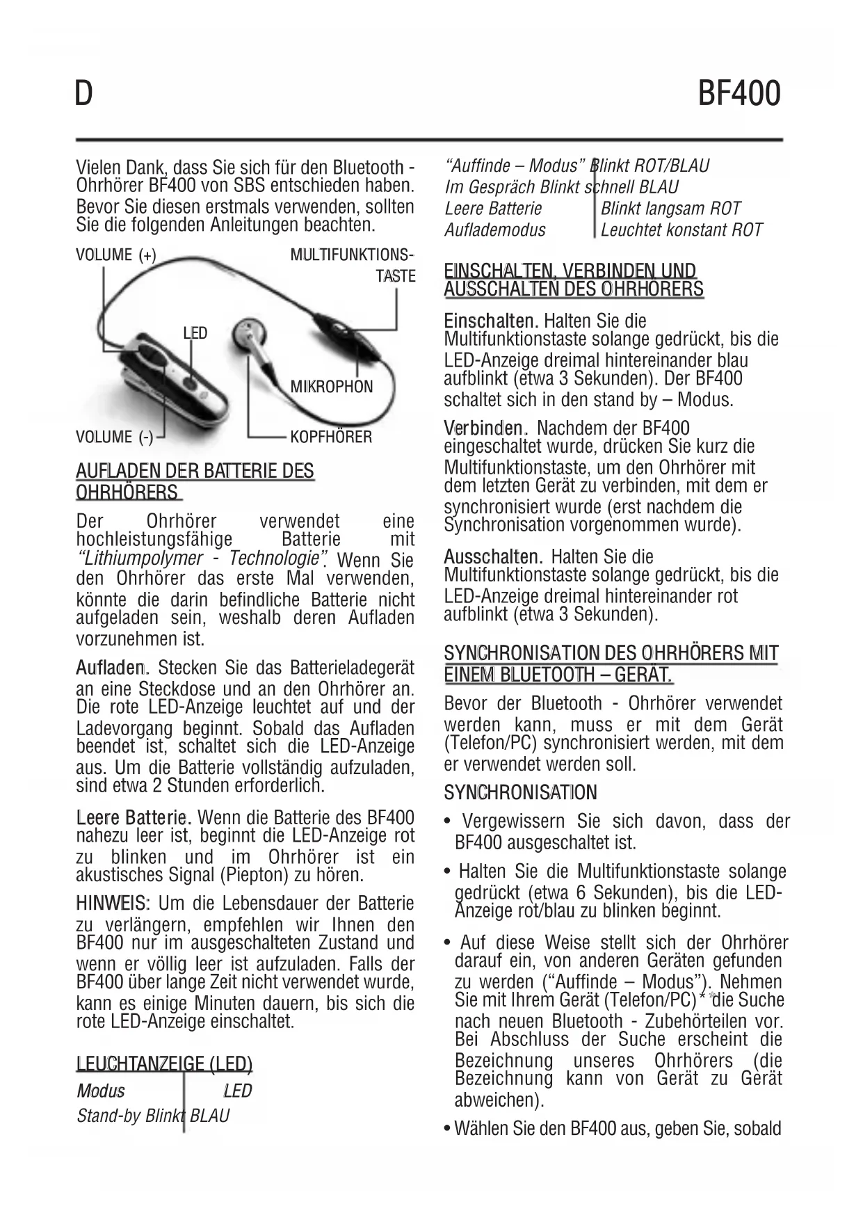 BF400 - Kopfhörer SBS - Kostenlose Bedienungsanleitung