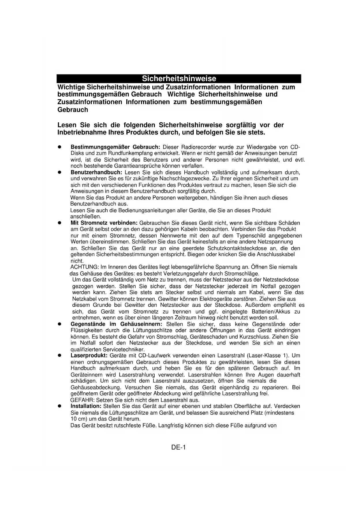 DE-1 Sicherheitshinweise Wichtige Sicherheitshinweise und Zusatzinformationen Informationen zum bestimmungsgemäßen Gebrauch Wichtige Sicherheitshinweise und Zusatzinformationen Informationen zum bestimmungsgemäßen Gebrauch Lesen Sie sich die folgenden Sicherheitshinweise sorgfältig vor der Inbetriebnahme Ihres Produktes durch, und befolgen Sie sie stets. Bestimmungsgemäßer Gebrauch: Dieser Radiorecorder wurde zur Wiedergabe von CD- Disks und zum Rundfunkempfang entwickelt. Wenn er nicht gemäß der Anweisungen benutzt wird, ist die Sicherheit des Benutzers und anderer Personen nicht gewährleistet, und evtl. noch bestehende Garantieansprüche können verfallen. Benutzerhandbuch: Lesen Sie sich dieses Handbuch vollständig und aufmerksam durch, und verwahren Sie es für zukünftige Nachschlagezwecke. Zu Ihrer eigenen Sicherheit und um sich mit den verschiedenen Funktionen des Produktes vertraut zu machen, lesen Sie sich die Anweisungen in diesem Benutzerhandbuch sorgfältig durch. Wenn Sie das Produkt an andere Personen weitergeben, händigen Sie ihnen auch dieses Benutzerhandbuch aus. Lesen Sie auch die Bedienungsanleitungen aller Geräte, die Sie an dieses Produkt anschließen. Mit Stromnetz verbinden: Gebrauchen Sie dieses Gerät nicht, wenn Sie sichtbare Schäden am Gerät selbst oder an den dazu gehörigen Kabeln beobachten. Verbinden Sie das Produkt nur mit einem Stromnetz, dessen Nennwerte mit den auf dem Typenschild angegebenen Werten übereinstimmen. Schließen Sie das Gerät keinesfalls an eine andere Netzspannung an. Schließen Sie das Gerät nur an eine geerdete Schutzkontaktsteckdose an, die den geltenden Sicherheitsbestimmungen entspricht. Biegen oder knicken Sie die Anschlusskabel nicht. ACHTUNG: Im Inneren des Gerätes liegt lebensgefährliche Spannung an. Öffnen Sie niemals das Gehäuse des Gerätes: es besteht Verletzungsgefahr durch Stromschläge. Um das Gerät vollständig vom Netz zu trennen, muss der Netzstecker aus der Netzsteckdose gezogen werden. Stellen Sie sicher, dass der Netzstecker jederzeit im Notfall gezogen werden kann. Ziehen Sie stets am Stecker selbst und niemals am Kabel, wenn Sie das Netzkabel vom Stromnetz trennen. Gewitter können Elektrogeräte zerstören. Ziehen Sie aus diesem Grunde bei Gewitter den Netzstecker aus der Steckdose. Außerdem empfiehlt es sich, das Gerät vom Stromnetz zu trennen und ggf. eingelegte Batterien/Akkus zu entnehmen, wenn es über einen längeren Zeitraum hinweg nicht benutzt werden soll. Gegenstände im Gehäuseinnern: Stellen Sie sicher, dass keine Gegenstände oder Flüssigkeiten durch die Lüftungsschlitze oder andere Öffnungen in das Gerät eindringen können. Es besteht die Gefahr von Stromschlag, Geräteschaden und Kurzschluss. Ziehen Sie im Notfall sofort den Netzstecker aus der Steckdose, und wenden Sie sich an einen qualifizierten Servicetechniker. Laserprodukt: Geräte mit CD-Laufwerk verwenden einen Laserstrahl (Laser-Klasse 1). Um einen ordnungsgemäßen Gebrauch dieses Produktes zu gewährleisten, lesen Sie dieses Handbuch aufmerksam durch, und heben Sie es für den späteren Gebrauch auf. Im Geräteinnern wird Laserstrahlung verwendet. Laserstrahlen können Ihre Augen dauerhaft schädigen. Um sich nicht dem Laserstrahl auszusetzen, öffnen Sie niemals die Gehäuseabdeckung. Versuchen Sie niemals, das Gerät eigenhändig zu reparieren. Bei geöffnetem Gerät oder geöffneter Abdeckung wird gefährliche Laserstrahlung frei. GEFAHR: Setzen Sie sich nicht dem Laserstrahl aus. Installation: Stellen Sie das Gerät auf einer ebenen und stabilen Oberfläche auf. Verdecken Sie niemals die Lüftungsschlitze am Gerät, und belassen Sie ausreichend Platz (mindestens 10 cm) um das Gerät herum. Das Gerät besitzt rutschfeste Füße. Langfristig können sich diese Füße aufgrund vonDE-2 Chemikalien auflösen. Daher empfehlen wir, das Gerät auf einer rutschfesten Oberfläche aufzustellen. ACHTUNG: Benutzen Sie das Gerät nur in geschlossenen Räumen und niemals im Freien! Kondensflüssigkeit: Wird das Gerät aus einer kalten in eine warme Umgebung gebracht (z.B. nach dem Transport), kann im Gehäuseinnern Kondensflüssigkeit entstehen. Um das Gerät vor Schäden und Ausfall zu schützen, warten Sie mindestens 2 Stunden, bevor Sie es benutzen. Gesundheitsschäden: Hohe Lautstärken können dauerhafte Gehörschäden hervorrufen. Regeln Sie die Lautstärke daher mit Vorsicht, insbesondere, wenn Sie (optionale) Kopf- oder Ohrhörer verwenden. Schließen Sie die (optionalen) Kopf- bzw. Ohrhörer stets an das Gerät an, bevor Sie dieses einschalten. Anderenfalls können plötzliche Lautstärkespitzen Ihr Gehör schädigen. Kinder: Lassen Sie Kinder niemals elektrische Geräte benutzen. Kinder können mögliche Gefahren nicht immer richtig erkennen. Batterien: Halten Sie Batterien außerhalb der Reichweite von Kindern. Tauschen Sie immer alle Batterien gleichzeitig aus (mischen Sie keine verbrauchten mit neuen Batterien). Schließen Sie die Akkus und Batterien nicht kurz. Halten Sie Batterien von Hitzequellen (direktes Sonnenlicht, Feuer usw.) fern. Bei unsachgemäßer Handhabung von Akkus und Batterien besteht Explosionsgefahr. Stellen Sie keine Gegenstände auf das Gerät, und drücken Sie niemals auf das Gehäuse oder gar den Bildschirm. Stellen Sie keine Behälter mit Flüssigkeiten auf oder neben das Gerät (z.B. Getränke, Vasen usw.). Offene Brandquellen, wie z.B. brennende Kerzen dürfen nicht auf das Gerät gestellt werden. Anderenfalls kann Ihr Produkt beschädigt werden. Umgebungseffekte: Halten Sie das Gerät von Wärmequellen (Heizgeräten, Öfen, Kochstellen, Kerzen usw.), direkter Sonneneinstrahlung, Staub, Schmutz, Erschütterungen, starken Magnetfelder, Feuchtigkeit und Regen fern. Reinigung: Trennen Sie das Gerät vom Stromnetz. Reinigen Sie das Gerät mit einem weichen, leicht angefeuchteten Tuch. Verwenden Sie zur Reinigung keine Chemikalien wie Alkohol oder Lösungsmittel. Durch derartige Substan