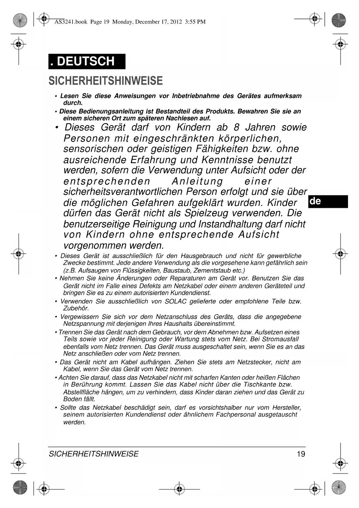 Finden Sie kostenlos die Bedienungsanleitung des Geräts AS3241 SOLAC als PDF.