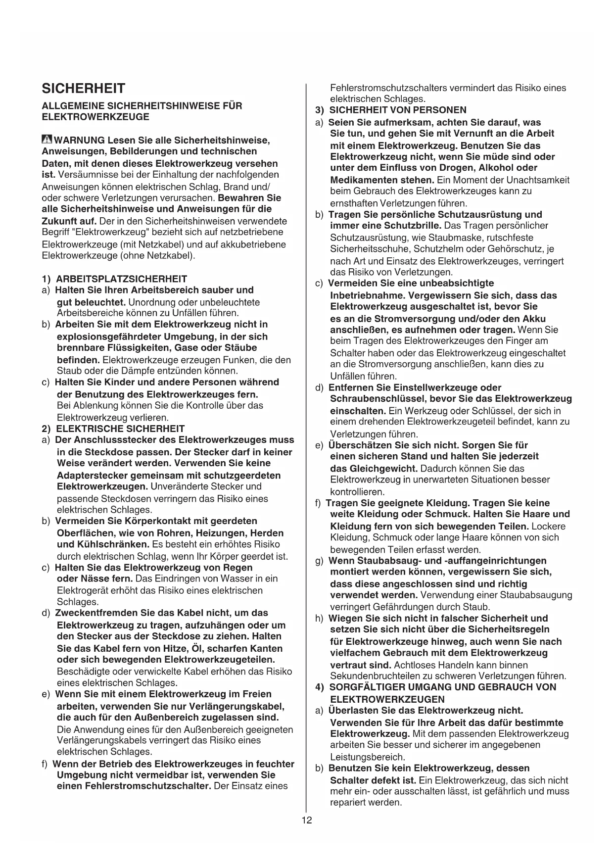 SICHERHEIT ALLGEMEINE SICHERHEITSHINWEISE FÜR ELEKTROWERKZEUGE WARNUNG Lesen Sie alle Sicherheitshinweise,