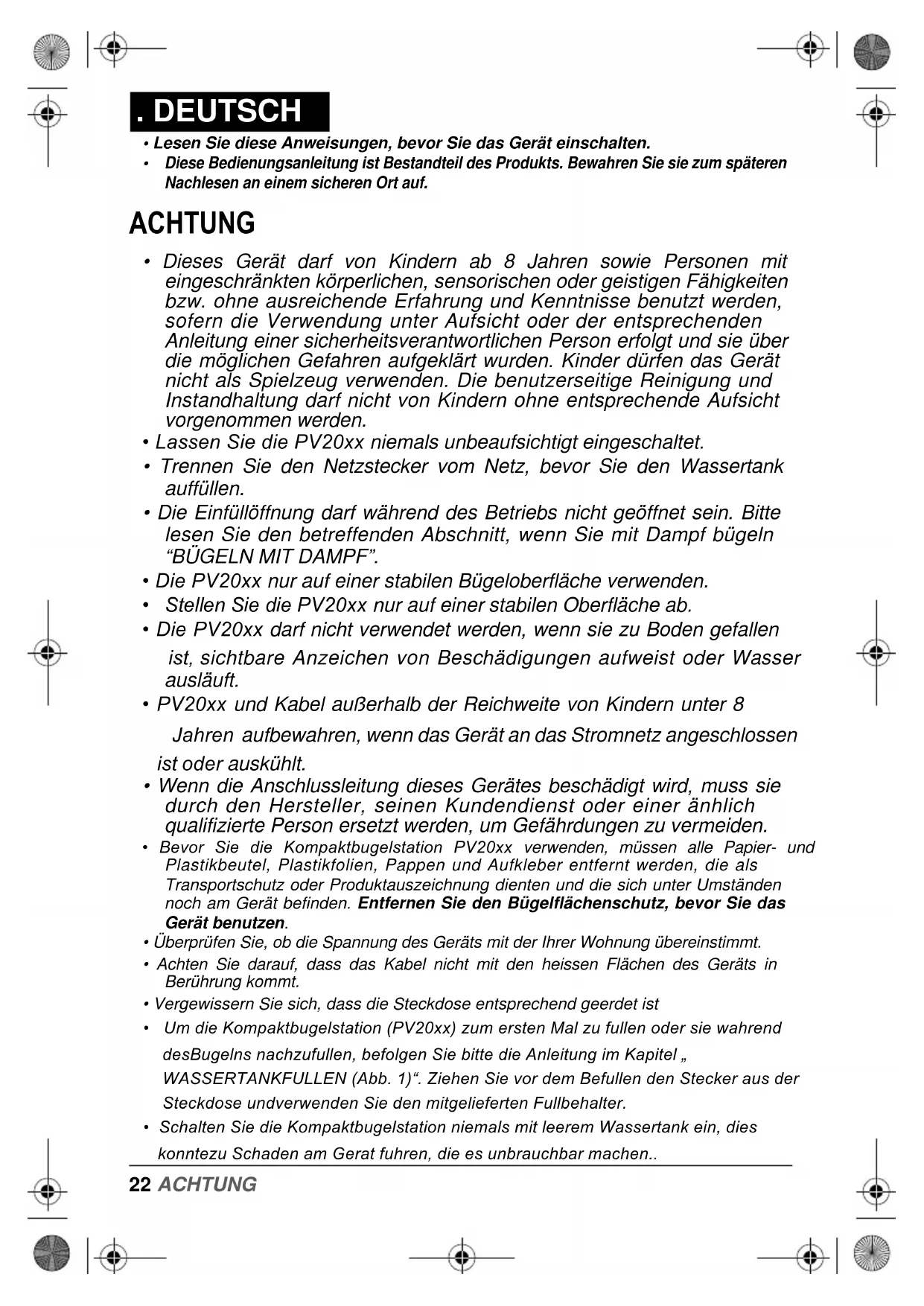 - Die PV20xx nur auf einer stabilen Bügeloberfläche verwenden.