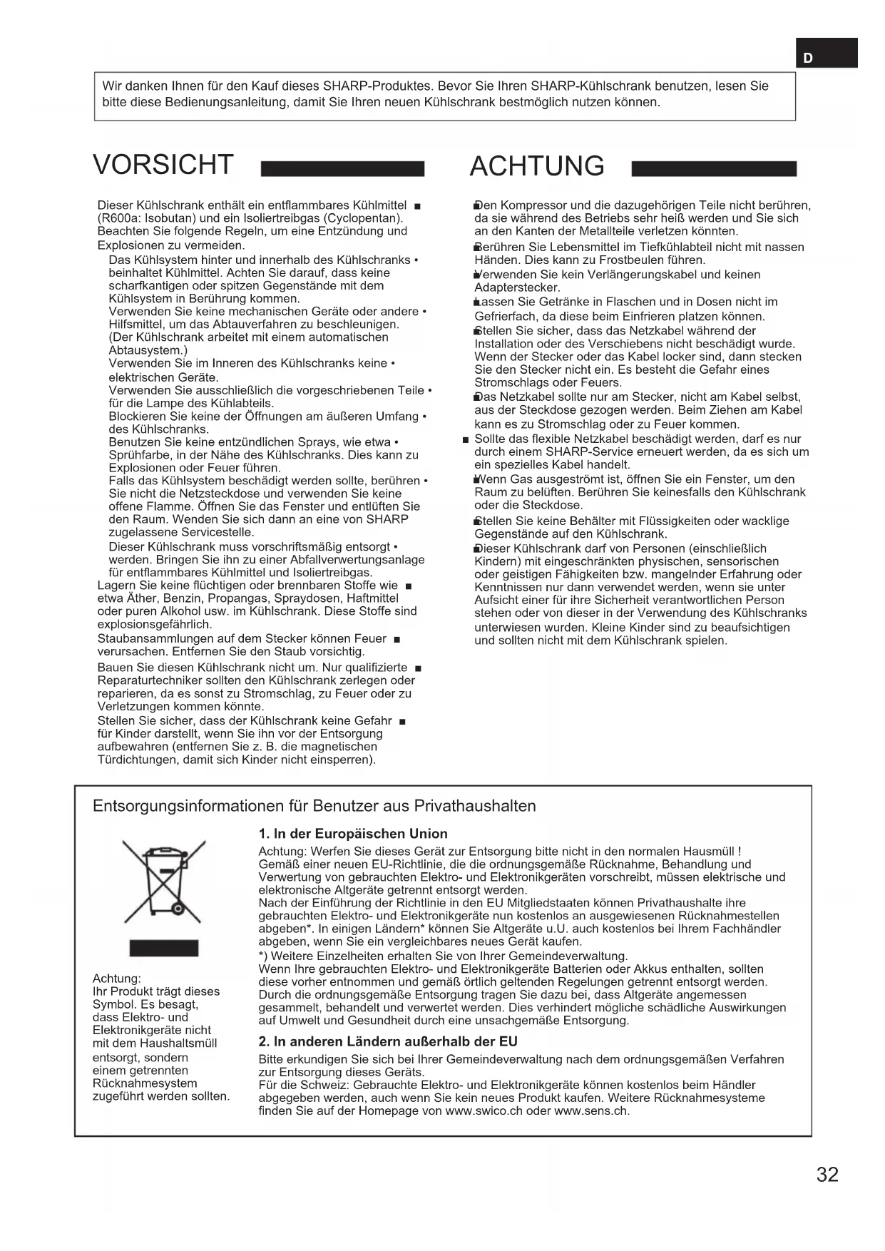 VORSICHT ACHTUNG Den Kompressor und die dazugehörigen Teile nicht berühren, ■da sie während des Betriebs sehr heiß werden und Sie sich an den Kanten der Metallteile verletzen könnten.Berühren Sie Lebensmittel im Tiefkühlabteil nicht mit nassen ■Händen. Dies kann zu Frostbeulen führen.Verwenden Sie kein Verlängerungskabel und keinen ■Adapterstecker. Lassen Sie Getränke in Flaschen und in Dosen nicht im ■Gefrierfach, da diese beim Einfrieren platzen können. Stellen Sie sicher, dass das Netzkabel während der ■Installation oder des Verschiebens nicht beschädigt wurde. Wenn der Stecker oder das Kabel locker sind, dann stecken Sie den Stecker nicht ein. Es besteht die Gefahr eines Stromschlags oder Feuers. Das Netzkabel sollte nur am Stecker, nicht am Kabel selbst, ■aus der Steckdose gezogen werden. Beim Ziehen am Kabel kann es zu Stromschlag oder zu Feuer kommen. Sollte das flexible Netzkabel beschädigt werden, darf es nur ■ durch einem SHARP-Service erneuert werden, da es sich um ein spezielles Kabel handelt.Wenn Gas ausgeströmt ist, öffnen Sie ein Fenster, um den ■Raum zu belüften. Berühren Sie keinesfalls den Kühlschrank oder die Steckdose.Stellen Sie keine Behälter mit Flüssigkeiten oder wacklige ■Gegenstände auf den Kühlschrank. Dieser Kühlschrank darf von Personen (einschließlich ■Kindern) mit eingeschränkten physischen, sensorischen oder geistigen Fähigkeiten bzw. mangelnder Erfahrung oder Kenntnissen nur dann verwendet werden, wenn sie unter Aufsicht einer für ihre Sicherheit verantwortlichen Person stehen oder von dieser in der Verwendung des Kühlschranks unterwiesen wurden. Kleine Kinder sind zu beaufsichtigen und sollten nicht mit dem Kühlschrank spielen. Entsorgungsinformationen für Benutzer aus Privathaushalten