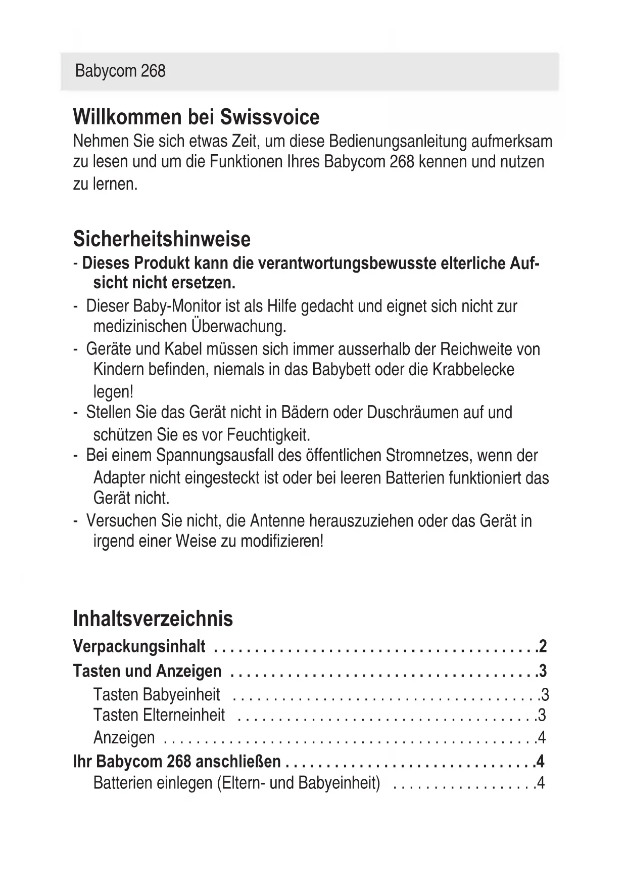- Babycom 268 DE_090909:Babycom 143 09.09.09 13:28 Seite U1Willkommen bei Swissvoice Nehmen Sie sich etwas Zeit, um diese Bedienungsanleitung aufmerksam zu lesen und um die Funktionen Ihres Babycom 268 kennen und nutzen zu lernen. Sicherheitshinweise - Dieses Produkt kann die verantwortungsbewusste elterliche Auf- sicht nicht ersetzen. - Dieser Baby-Monitor ist als Hilfe gedacht und eignet sich nicht zur medizinischen Überwachung. - Geräte und Kabel müssen sich immer ausserhalb der Reichweite von Kindern befinden, niemals in das Babybett oder die Krabbelecke legen! - Stellen Sie das Gerät nicht in Bädern oder Duschräumen auf und schützen Sie es vor Feuchtigkeit. - Bei einem Spannungsausfall des öffentlichen Stromnetzes, wenn der Adapter nicht eingesteckt ist oder bei leeren Batterien funktioniert das Gerät nicht. - Versuchen Sie nicht, die Antenne herauszuziehen oder das Gerät in irgend einer Weise zu modifizier en! Babycom 268 Inhaltsverzeichnis Verpackungsinhalt p. 2