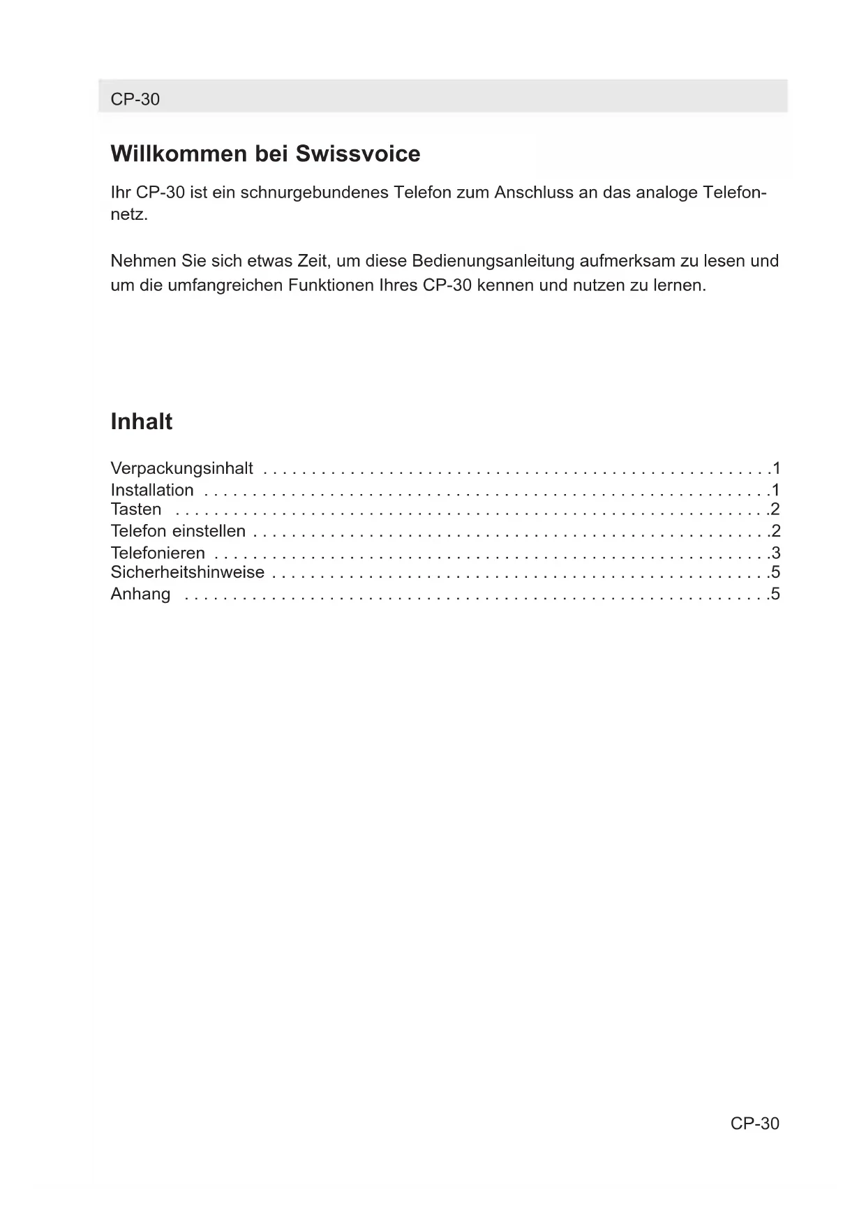- Analogue telephone CP-30 Instrucciones Bedienungsanleitung Mode d’emploi Istruzioni per l’uso User manual Instrukcja ObsługiWillkommen bei Swissvoice Ihr CP-30 ist ein schnurgebundenes Telefon zum Anschluss an das analoge Telefon- netz. Nehmen Sie sich etwas Zeit, um diese Bedienungsanleitung aufmerksam zu lesen und um die umfangreichen Funktionen Ihres CP-30 kennen und nutzen zu lernen. Inhalt Verpackungsinhalt p. 1
