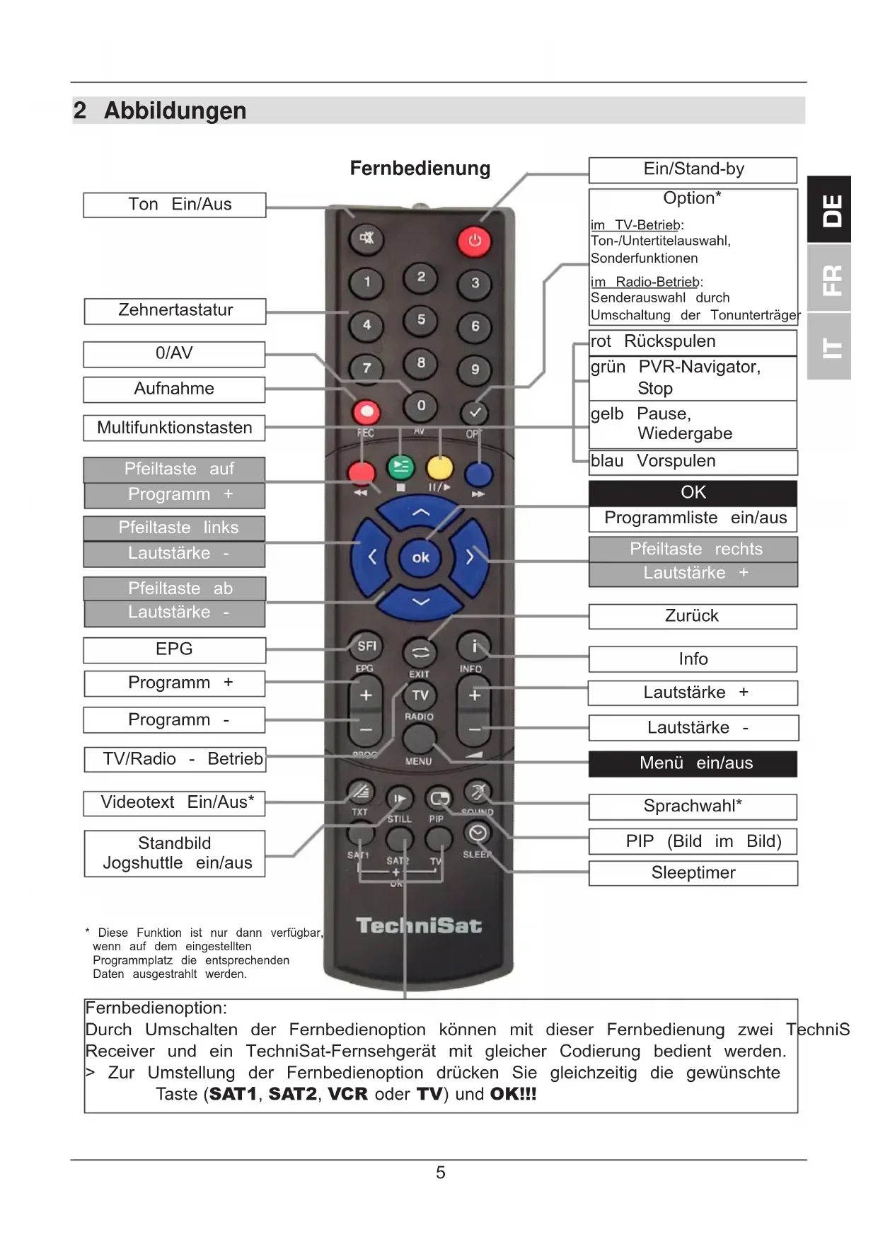 - Diese Funktion ist nur dann verfügbar,wenn auf dem eingestelltenProgrammplatz die entsprechendenDaten ausgestrahlt werden. 0/AV Aufnahme Multifunktionstasten TV/Radio - Betrieb Videotext Ein/Aus* Sleeptimer PIP (Bild im Bild) Lautstärke + rot Rückspulen grün PVR-Navigator, Stop gelb Pause, Wiedergabe blau Vorspulen Lautstärke - Fernbedienoption: Durch Umschalten der Fernbedienoption können mit dieser Fernbedienung zwei TechniSat- Receiver und ein TechniSat-Fernsehgerät mit gleicher Codierung bedient werden. > Zur Umstellung der Fernbedienoption drücken Sie gleichzeitig die gewünschte Taste (SAT1, SAT2, VCR oder TV) und OK!!!6 Antennen- Eingang SCART-Buchse