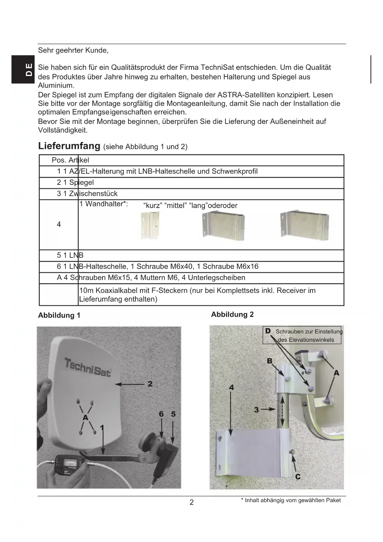 D Schrauben zur Einstellung des Elevationswinkels Abbildung 1 Abbildung 2 Pos. Artikel 1 1 AZ/EL-Halterung mit LNB-Halteschelle und Schwenkprofil 2 1 Spiegel 3 1 Zwischenstück
