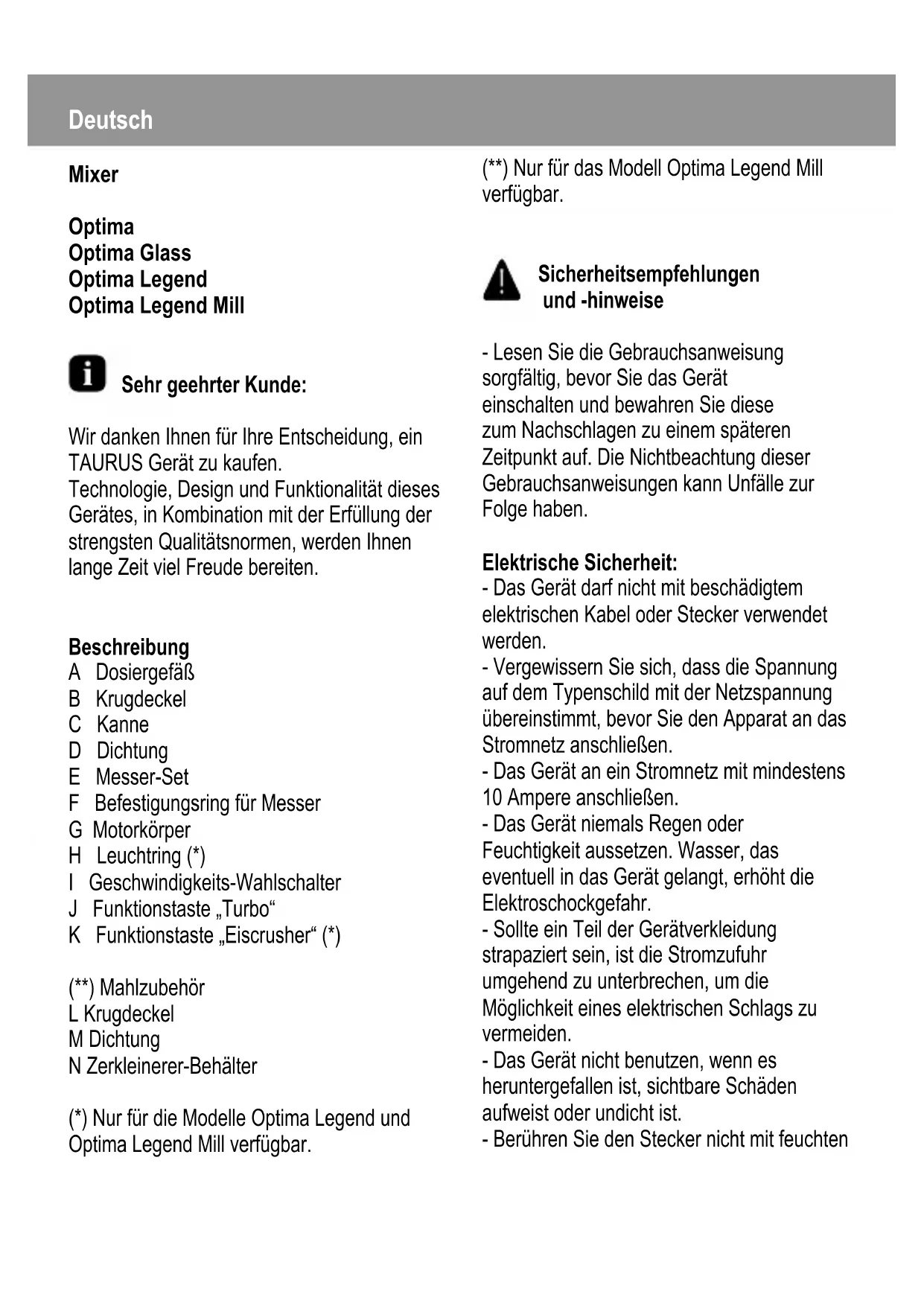 Optima Legend - Mixer TAURUS - Kostenlose Bedienungsanleitung