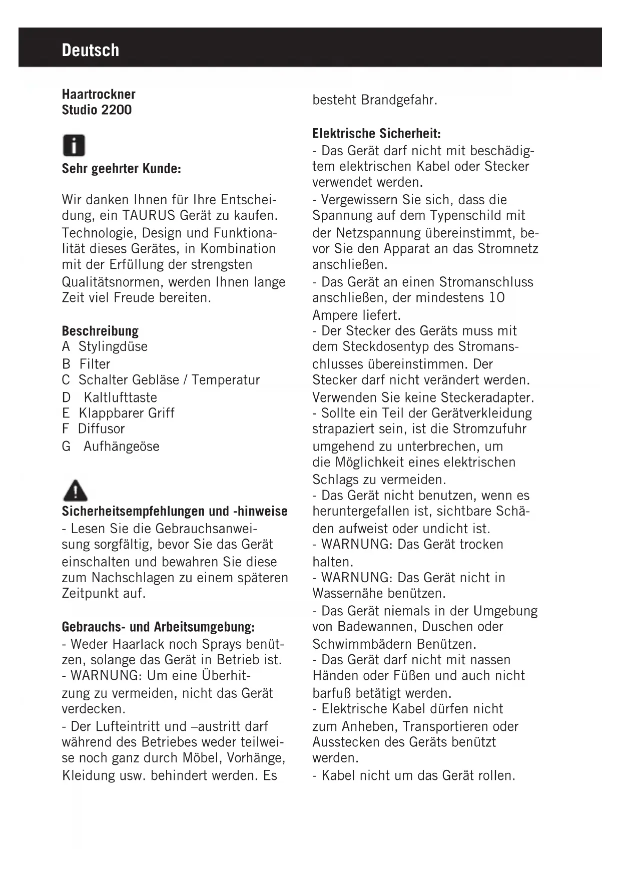 Studio 2200 - Haartrockner TAURUS - Kostenlose Bedienungsanleitung