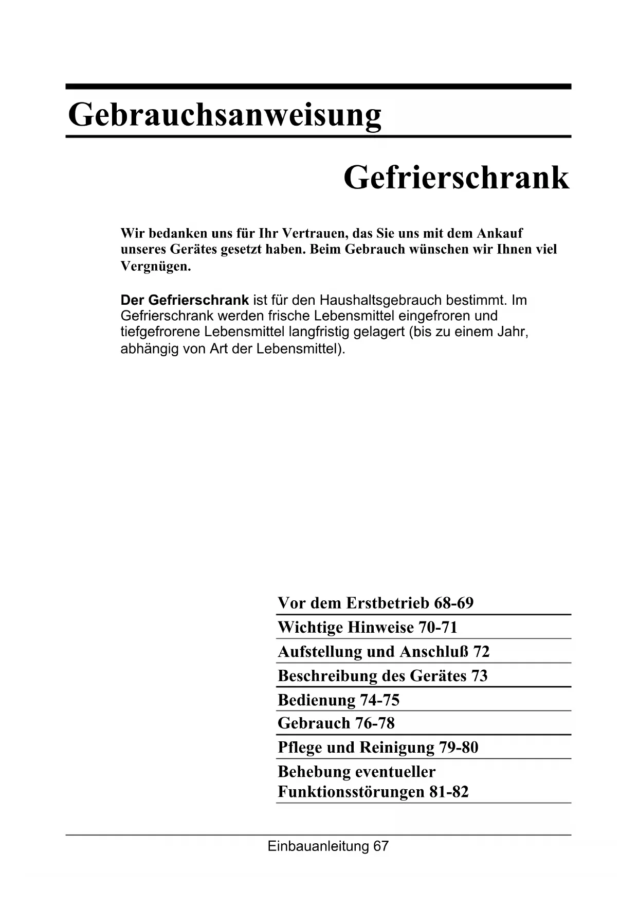 - Après le démarrage de l'appareil, le fonctionnement du compresseur et le décantage du réfrigérant sont un peu plus bruyants. Ce n'est pas un défaut et n'a aucune influence sur la longévité de l'appareil. Avec le temps, l'intensité de ces bruits devient diminuée. NOUS NOUS RESERVONS LE DROIT DES MODIFICATIONS QUI N'ONT PAS UNE INFLUENCE SUR LE FONCTIONNEMENT DE L'APPAREIL.Einbauanleitung 67 Gebrauchsanweisung Gefrierschrank Wir bedanken uns für Ihr Vertrauen, das Sie uns mit dem Ankauf unseres Gerätes gesetzt haben. Beim Gebrauch wünschen wir Ihnen viel Vergnügen. Der Gefrierschrank ist für den Haushaltsgebrauch bestimmt. Im Gefrierschrank werden frische Lebensmittel eingefroren und tiefgefrorene Lebensmittel langfristig gelagert (bis zu einem Jahr, abhängig von Art der Lebensmittel). Vor dem Erstbetrieb 68-69 Wichtige Hinweise 70-71 Aufstellung und Anschluß 72 Beschreibung des Gerätes 73 Bedienung 74-75 Gebrauch 76-78 Pflege und Reinigung 79-80 Behebung eventueller Funktionsstörungen 81-82Einbauanleitung68 Vor dem Erstbetrieb