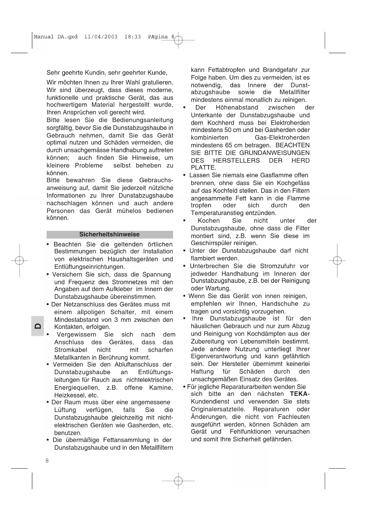 Finden Sie kostenlos die Bedienungsanleitung des Geräts DA 90 TEKA als PDF.