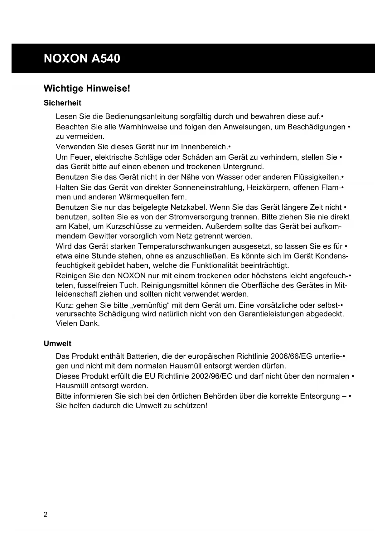 Wichtige Hinweise! Sicherheit Lesen Sie die Bedienungsanleitung sorgfältig durch und bewahren diese auf.• Beachten Sie alle Warnhinweise und folgen den Anweisungen, um Beschädigungen • zu vermeiden. Verwenden Sie dieses Gerät nur im Innenbereich.• Um Feuer, elektrische Schläge oder Schäden am Gerät zu verhindern, stellen Sie • das Gerät bitte auf einen ebenen und trockenen Untergrund. Benutzen Sie das Gerät nicht in der Nähe von Wasser oder anderen Flüssigkeiten.• Halten Sie das Gerät von direkter Sonneneinstrahlung, Heizkörpern, offenen Flam-• men und anderen Wärmequellen fern. Benutzen Sie nur das beigelegte Netzkabel. Wenn Sie das Gerät längere Zeit nicht • benutzen, sollten Sie es von der Stromversorgung trennen. Bitte ziehen Sie nie direkt am Kabel, um Kurzschlüsse zu vermeiden. Außerdem sollte das Gerät bei aufkom- mendem Gewitter vorsorglich vom Netz getrennt werden. Wird das Gerät starken Temperaturschwankungen ausgesetzt, so lassen Sie es für • etwa eine Stunde stehen, ohne es anzuschließen. Es könnte sich im Gerät Kondens- feuchtigkeit gebildet haben, welche die Funktionalität beeinträchtigt. Reinigen Sie den NOXON nur mit einem trockenen oder höchstens leicht angefeuch-• teten,fusselfreienTuch.ReinigungsmittelkönnendieOberächedesGerätesinMit- leidenschaft ziehen und sollten nicht verwendet werden. Kurz: gehen Sie bitte „vernünftig“ mit dem Gerät um. Eine vorsätzliche oder selbst-• verursachte Schädigung wird natürlich nicht von den Garantieleistungen abgedeckt. Vielen Dank. Umwelt Das Produkt enthält Batterien, die der europäischen Richtlinie 2006/66/EG unterlie-• gen und nicht mit dem normalen Hausmüll entsorgt werden dürfen. Dieses Produkt erfüllt die EU Richtlinie 2002/96/EC und darf nicht über den normalen • Hausmüll entsorgt werden. Bitte informieren Sie sich bei den örtlichen Behörden über die korrekte Entsorgung – • Sie helfen dadurch die Umwelt zu schützen!English Nederlands Espanol Italiano Francais DeutschEnglish