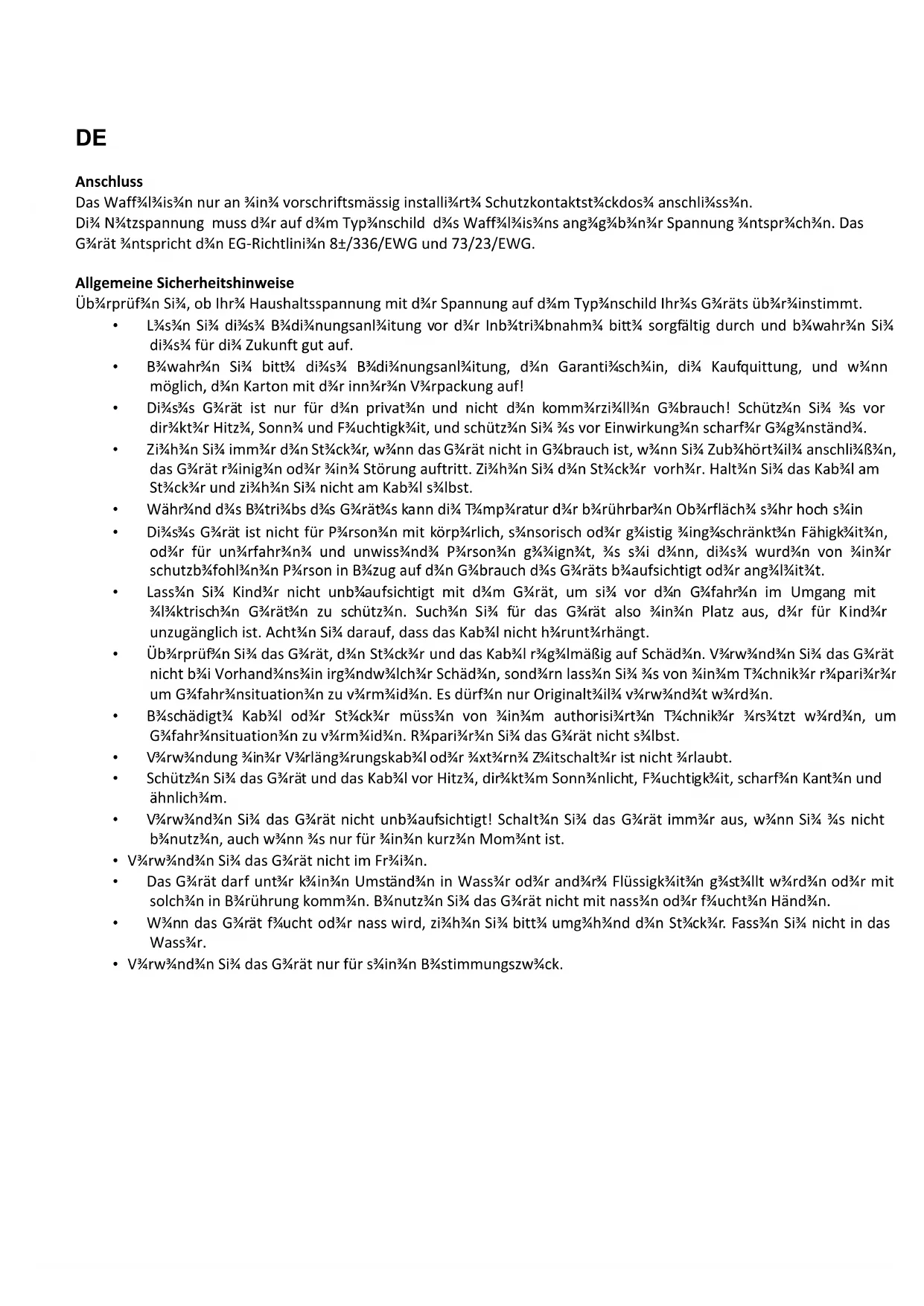 - Lass ^3/4 n Si ^3/4 Kind ^3/4 r nicht unb ^3/4 aufsichtigt mit d ^3/4 m G ^3/4 rät, um si ^3/4 vor d ^3/4 n G ^3/4 fahr ^3/4 n im Umgang mit ^3/4 l ^3/4 ktrisch ^3/4 n G ^3/4 rät ^3/4 n zu schütz ^3/4 n. Such ^3/4 n Si ^3/4 für das G ^3/4 rät also ^3/4 in ^3/4 n Platz aus, d ^3/4 r für Kind ^3/4 r unzugänglich ist. Acht ^3/4 n Si ^3/4 darauf, dass das Kab ^3/4 l nicht h ^3/4 runt ^3/4 rhängt.