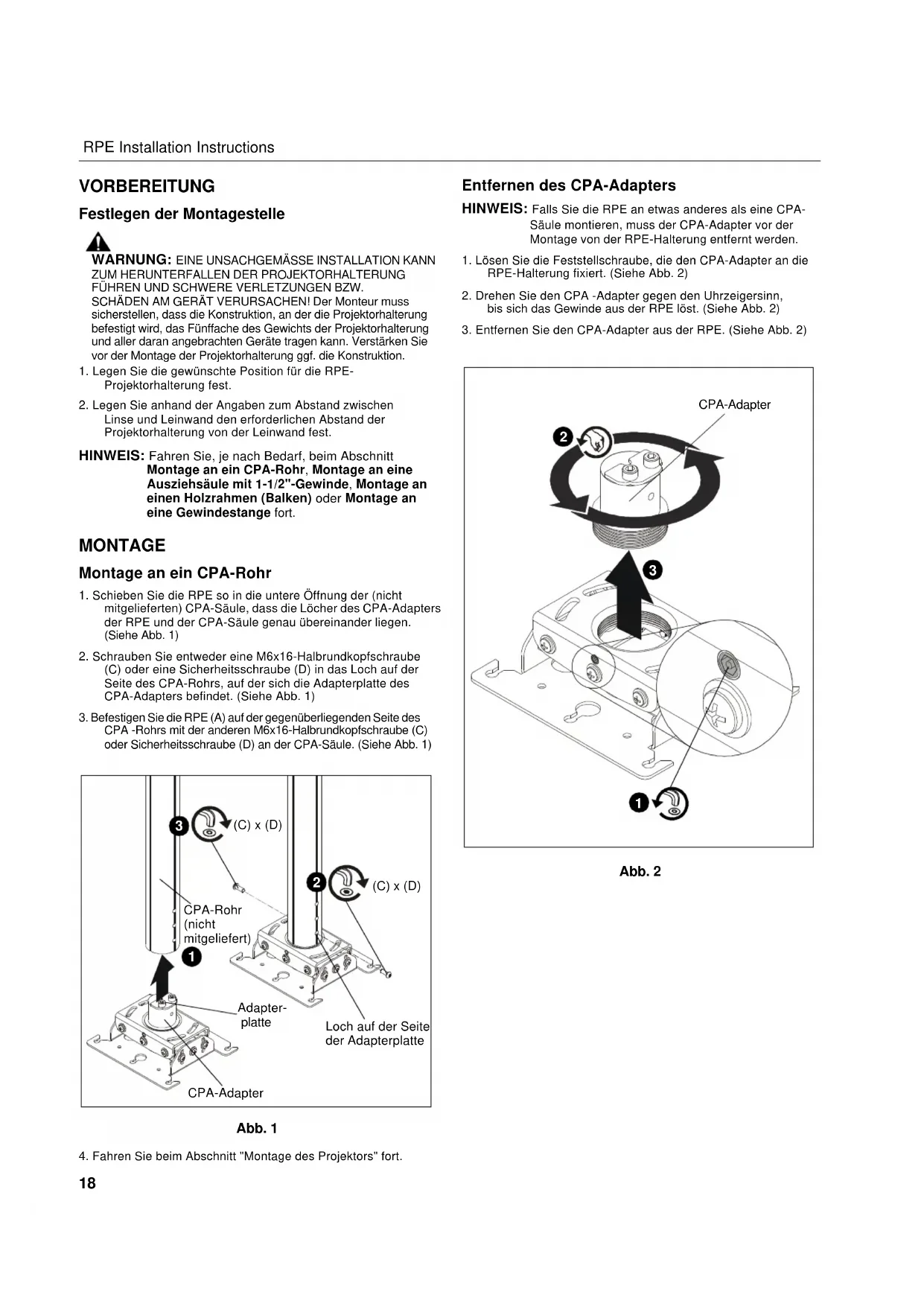 Linse und Leinwand den erforderlichen Abstand der Projektorhalterung von der Leinwand fest. HINWEIS: Fahren Sie, je nach Bedarf, beim Abschnitt Montage an ein CPA-Rohr, Montage an eine Ausziehsäule mit 1-1/2"-Gewinde, Montage an einen Holzrahmen (Balken) oder Montage an eine Gewindestange fort. MONTAGE Montage an ein CPA-Rohr