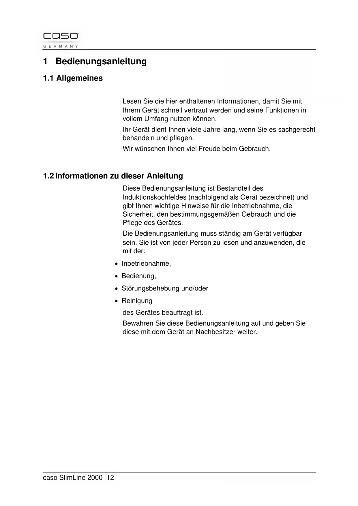 8 Entsorgung des Altgerätes Elektrische und elektronische Altgeräte enthalten vielfach noch wertvolle Materialien. Sie enthalten aber auch schädliche Stoffe, die für ihre Funktion und Sicherheit notwendig waren. Im Restmüll oder bei falscher Behandlung können diese der menschlichen Gesundheit und der Umwelt schaden. Geben Sie Ihr Altgerät deshalb auf keinen Fall in den Restmüll. ► Nutzen Sie die von Ihrem Wohnort eingerichtete Sammelstelle zur Rückgabe und Verwertung elektrischer und elektronischer Altgeräte. Informieren Sie sich gegebenenfalls bei Ihrem Rathaus, Ihrer Müllabfuhr oder bei Ihrem Händler. ► Sorgen Sie dafür, dass Ihr Altgerät bis zum Abtransport kindersicher aufbewahrt wird.caso SlimLine 2000 36 9 Garantie Für dieses Produkt übernehmen wir beginnend vom Verkaufsdatum 24 Monate Garantie für Mängel, die auf Fertigungs- oder Werkstofffehler zurückzuführen sind. Ihre gesetzlichen Gewährleistungsansprüche nach §439 ff. BGB-E bleiben hiervon unberührt. In der Garantie nicht enthalten sind Schäden, die durch unsachgemäße Behandlung oder Einsatz entstanden sind, sowie Mängel, welche die Funktion oder den Wert des Gerätes nur geringfügig beeinflussen. Weitergehend sind Verschleißteile, Transportschäden, soweit wir dies nicht zu verantworten haben, sowie Schäden, die durch nicht von uns durchgeführte Reparaturen entstanden sind, vom Garantieanspruch ausgeschlossen. Dieses Gerät ist für den Gebrauch im privaten Bereich (Haushaltseinsatz) konstruiert und leistungsmäßig ausgelegt. Eine etwaige Nutzung im gewerblichen Einsatz fällt nur soweit unter die Garantie, wie es sich im Umfang mit der Beanspruchung einer privaten Nutzung vergleichen lässt. Es ist nicht für den weitergehenden, gewerblichen Gebrauch bestimmt. Bei berechtigten Reklamationen werden wir das mangelhafte Gerät nach unserer Wahl reparieren oder gegen ein mängelfreies Gerät austauschen. Offene Mängel sind innerhalb von 14 Tagen nach Lieferung anzuzeigen. Weitere Ansprüche sind ausgeschlossen. Zur Geltendmachung eines Garantieanspruches setzen Sie sich bitte vor einer Rücksendung des Gerätes (immer mit Kaufbeleg!) mit unserem Service in Verbindung.caso SlimLine 2000 37 10 Technische Daten Gerät Induktionskocher Name SlimLine Modell CJ-513A Artikel-Nr. 2200 Anschlussdaten 230 V, 50 Hz Leistungsaufnahme 2000 W (Max.) < 0,5 W (Standby) Temperaturbereich 60°C – 220 °C Außenabmessungen (B/H/T) 275 x 60 x 355 mm Gewicht 2,3 kgcaso SlimLine 2000 38 Original Operating manual Induction Hot plate SlimLine 2000 Item no. 2200caso SlimLine 2000 39 11 Operating Manual