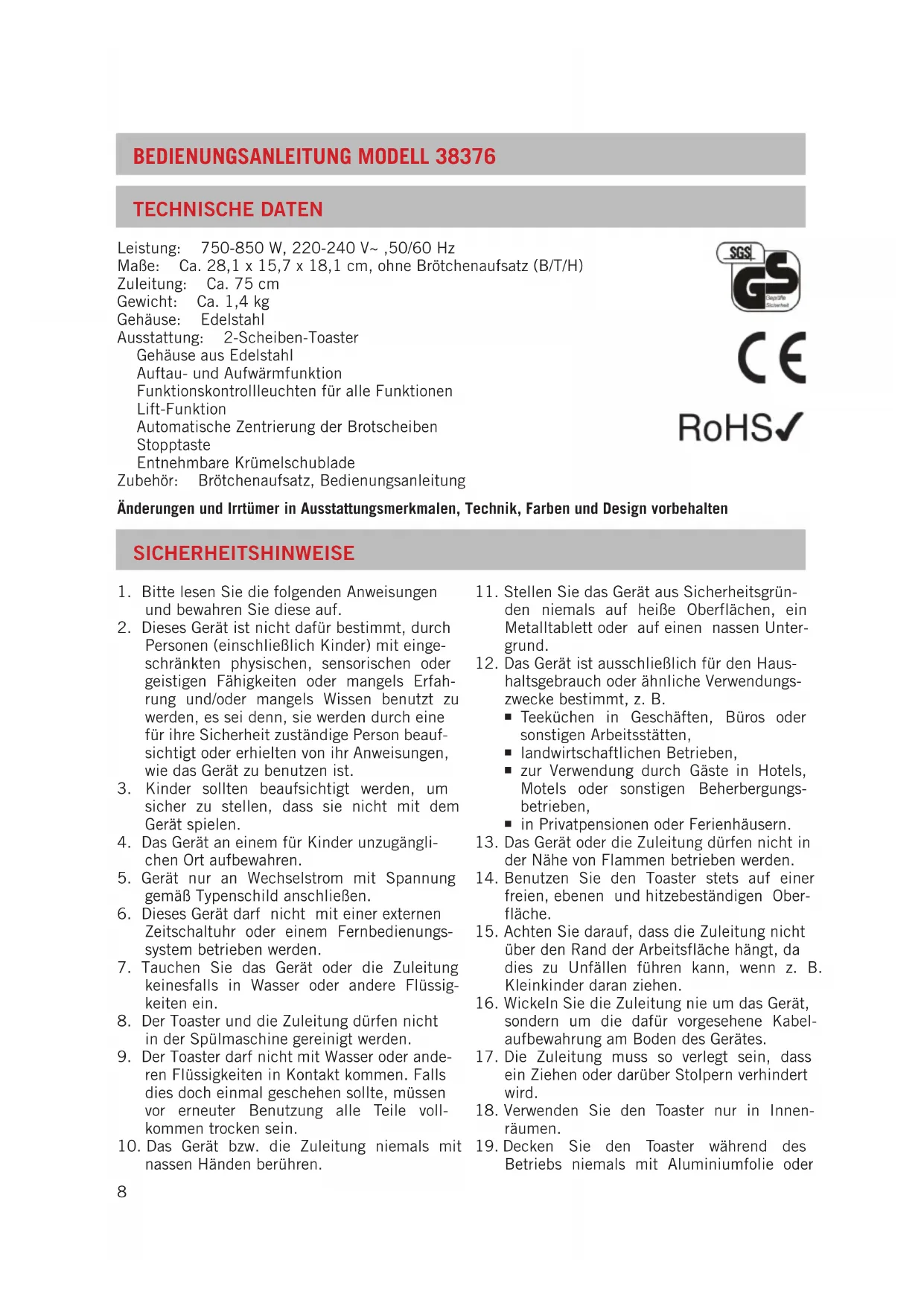 sicherheiTshinweise Technische daTen Leistung: 750-850 W, 220-240 V~ ,50/60 Hz Maße: Ca. 28,1 x 15,7 x 18,1 cm, ohne Brötchenaufsatz (B/T/H) Zuleitung: Ca. 75 cm Gewicht: Ca. 1,4 kg Gehäuse: Edelstahl Ausstattung: 2-Scheiben-Toaster Gehäuse aus Edelstahl Auftau- und Aufwärmfunktion Funktionskontrollleuchten für alle Funktionen Lift-Funktion Automatische Zentrierung der Brotscheiben Stopptaste Entnehmbare Krümelschublade Zubehör: Brötchenaufsatz, Bedienungsanleitung