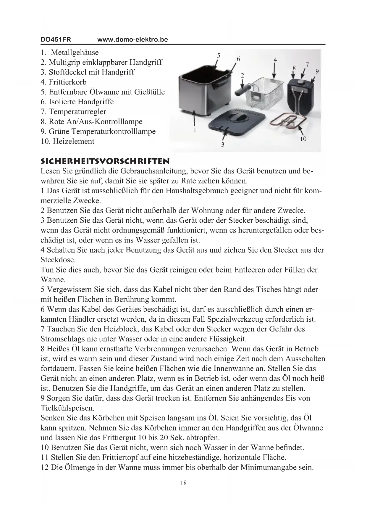 10www.domo-elektro.be DO451FR Benutzen Sie das Gerät nie, wenn kein, zu wenig oder zu viel Öl in der Wanne ist.