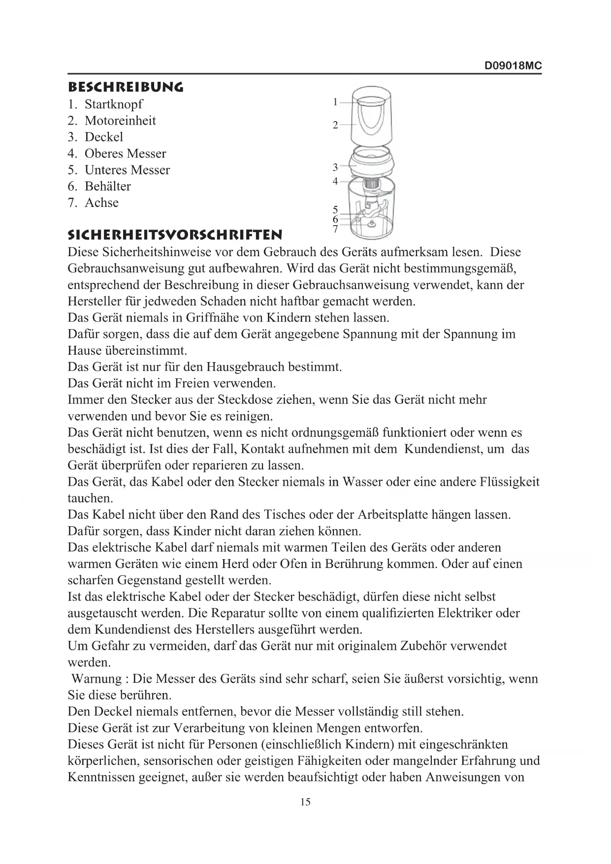 Warnung : Die Messer des Geräts sind sehr scharf, seien Sie äußerst vorsichtig, wenn Sie diese berühren.