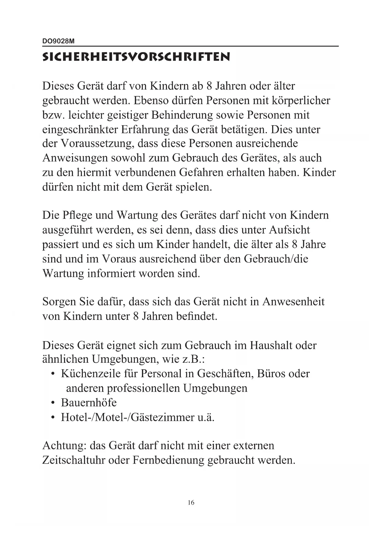 - Hotel-/Motel-/Gästezimmer u.ä. Achtung: das Gerät darf nicht mit einer externen Zeitschaltuhr oder Fernbedienung gebraucht werden.DO9028M