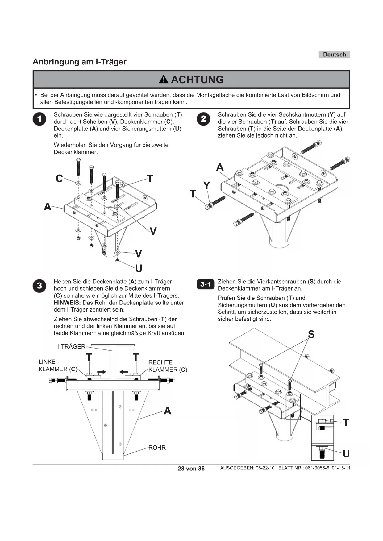 L28 von 36 AUSGEGEBEN: 06-22-10 BLATT NR.: 061-9055-6 01-15-11 Deutsch Schrauben Sie wie dargestellt vier Schrauben (T) durch acht Scheiben (V), Deckenklammer (C), Deckenplatte (A) und vier Sicherungsmuttern (U) ein. Wiederholen Sie den Vorgang für die zweite Deckenklammer. Heben Sie die Deckenplatte (A) zum I-Träger hoch und schieben Sie die Deckenklammern (C) so nahe wie möglich zur Mitte des I-Trägers. HINWEIS: Das Rohr der Deckenplatte sollte unter dem I-Träger zentriert sein. Ziehen Sie abwechselnd die Schrauben (T) der rechten und der linken Klammer an, bis sie auf beide Klammern eine gleichmäßige Kraft ausüben. Schrauben Sie die vier Sechskantmuttern (Y) auf die vier Schrauben (T) auf. Schrauben Sie die vier Schrauben (T) in die Seite der Deckenplatte (A), ziehen Sie sie jedoch nicht an. Ziehen Sie die Vierkantschrauben (S) durch die Deckenklammer am I-Träger an. Prüfen Sie die Schrauben (T) und Sicherungsmuttern (U) aus dem vorhergehenden Schritt, um sicherzustellen, dass sie weiterhin sicher befestigt sind.